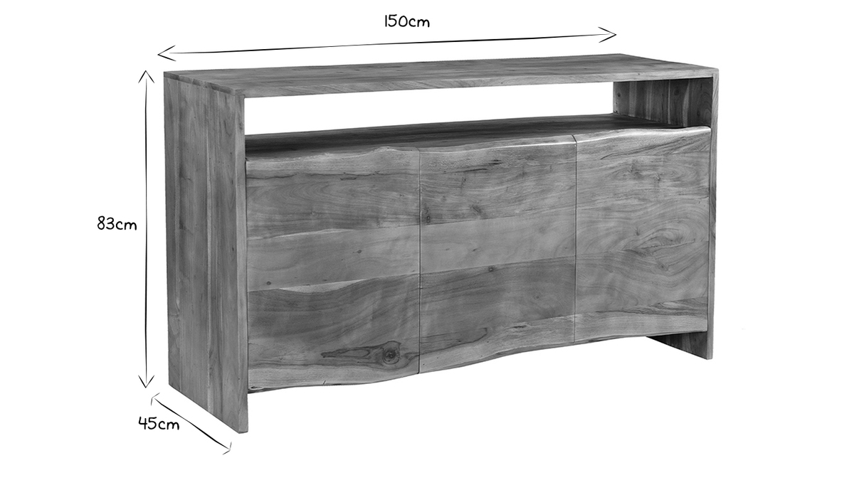 Équilibre des proportions. Ce grand buffet aux dimensions L150 x P45 x H83 cm meublera l'espace sans l'encombrer et optimisera votre pièce de vie grâce à ses six spacieux rangements fermés par trois portes battantes. Parfait pour accueillir du linge de maison, de la vaisselle ou encore des documents, ce buffet en bois massif est également composé d'une large niche ouverte sur laquelle il sera possible de placer des magazines, des petits appareils numériques ou encore des paniers de rangement décoratifs. Le fond du meuble est en panneaux de fibres de bois.