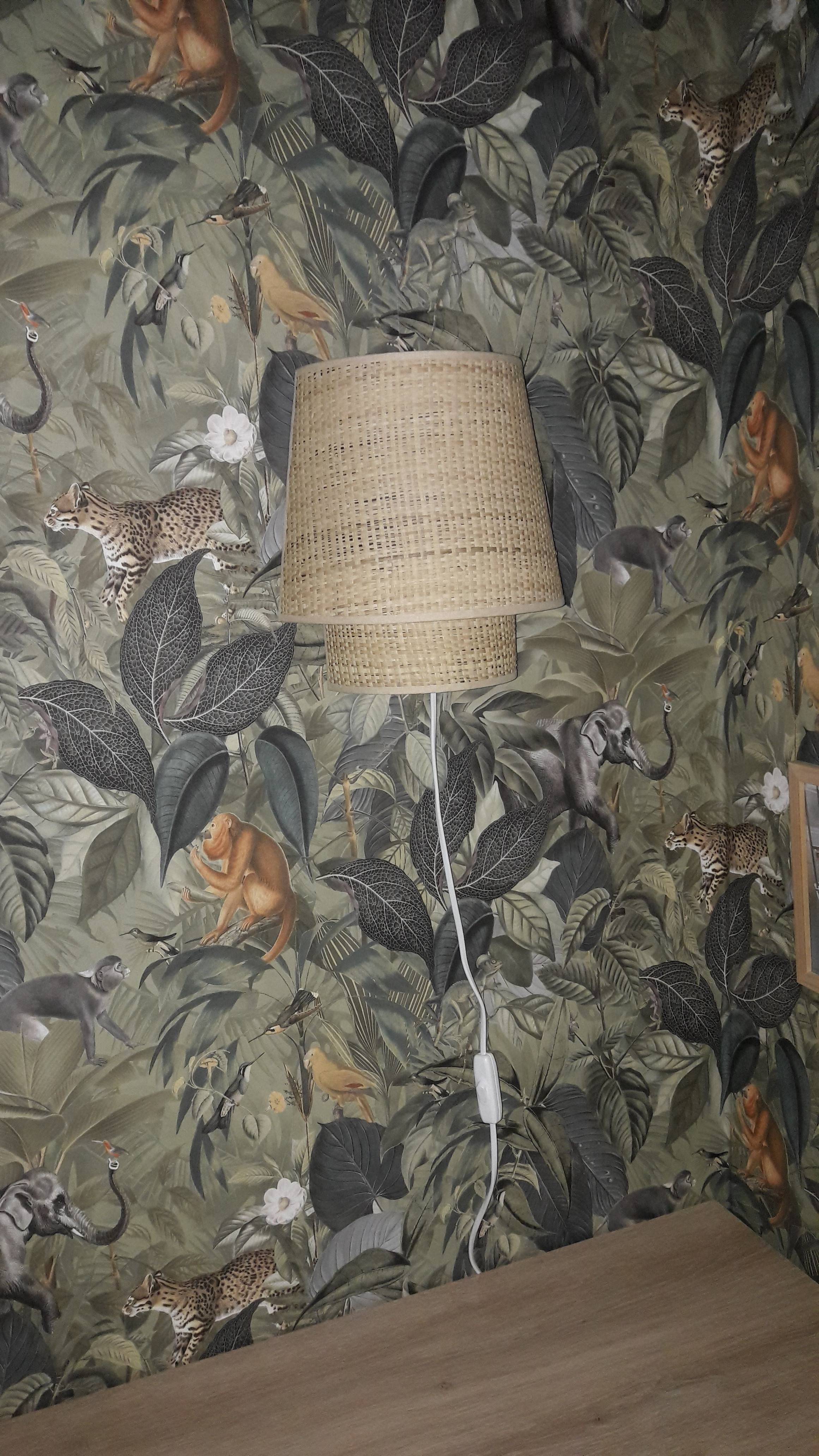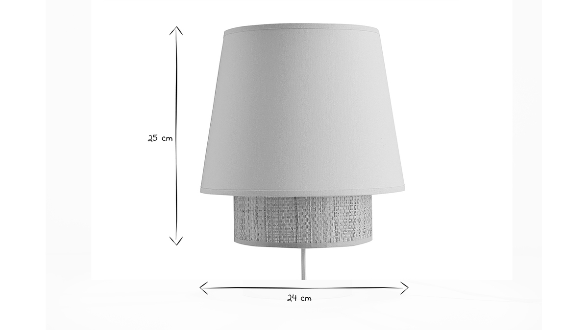 Matière : abat-jour en rabane et coton, carcasse abat-jour en métal blanc, câble électrique en plastique