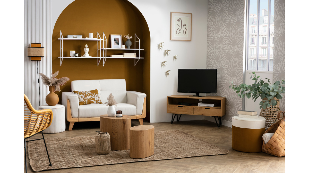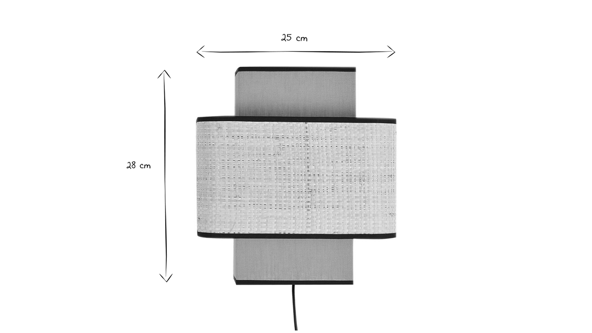 Sa jolie composition géométrique fait la part belle à la matière. L'abat-jour conjugue harmonieusement deux matières naturelles dans l'air du temps : le lin et la rabane. Le premier rectangle revêt un tissu en lin au coloris jaune moutarde très lumineux. Il est surmonté d'un second rectangle habillé d'un tissu rabane 100% naturel. Sa silhouette contemporaine est délicatement soulignée par le biais noir.