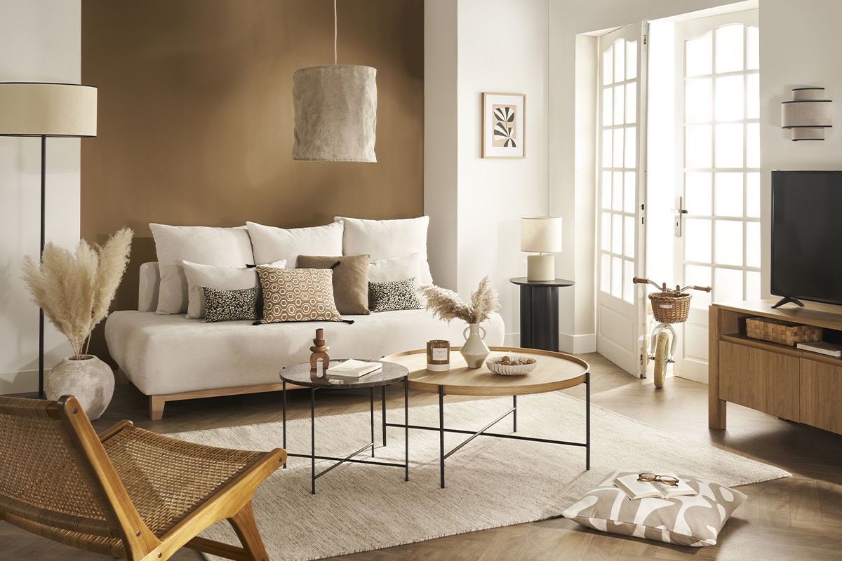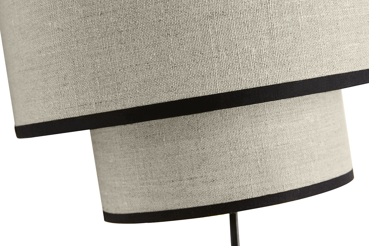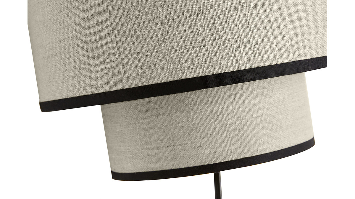 On affectionne tout particulièrement la lumière douce et tamisée que laissent filtrer les matières naturelles. Le duo d'abat-jour, ouverts en haut et en bas, oriente les faisceaux de la lumière principalement au sol et au plafond.