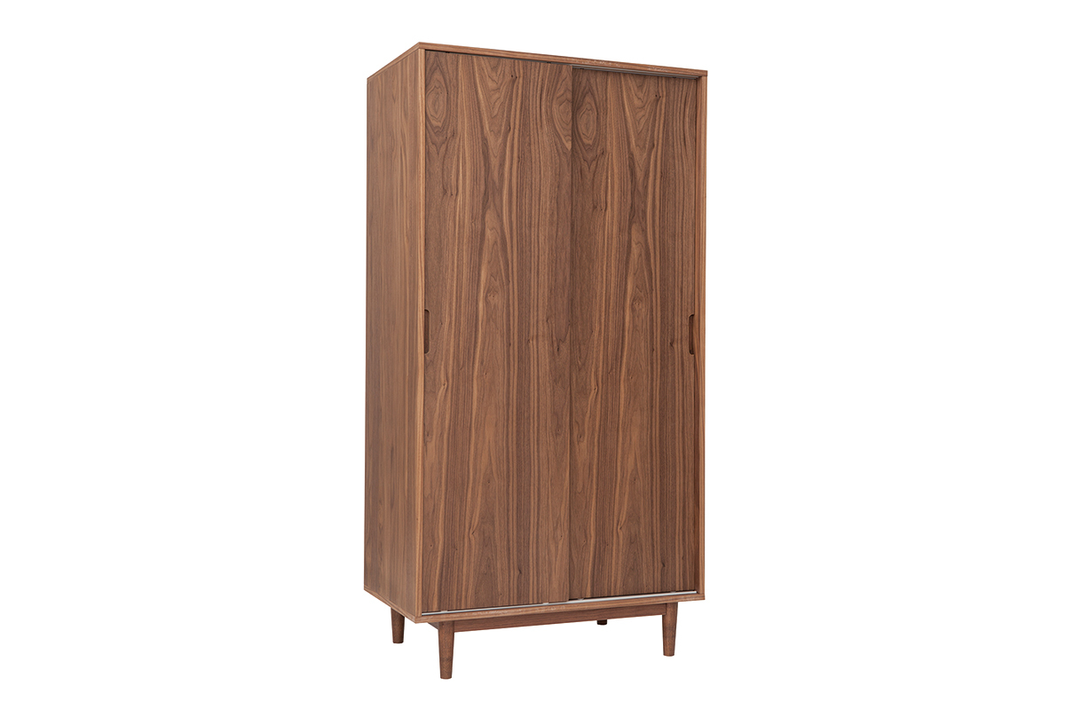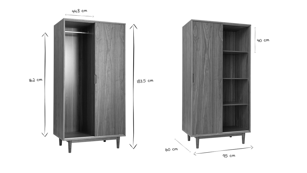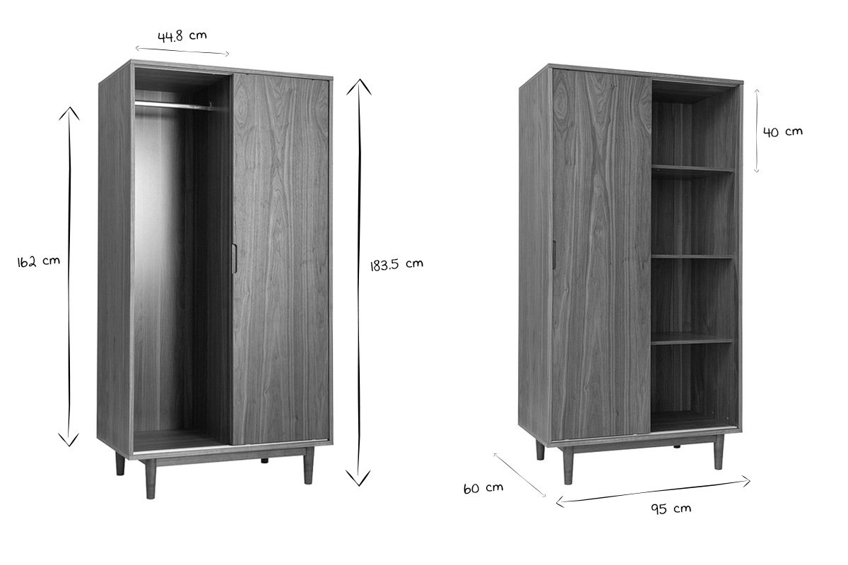 Une silhouette intemporelle à l'esprit pratique ! Véritable gain de place, les portes coulissantes - aux poignées minimalistes intégrées - renferment une penderie (L44.8 x P52.5 x H162 cm) et une étagère composée de quatre niches (L44.3 x P52.5 x H40 cm). Parfaite pour accueillir vos vestes, des vêtements, des boîtes à chaussures ou du linge de maison, la structure en panneaux de fibres de bois placage noyer et les quatre pieds en hévéa massif teinté noyer assurent robustesse et pérennité.