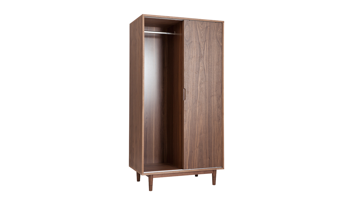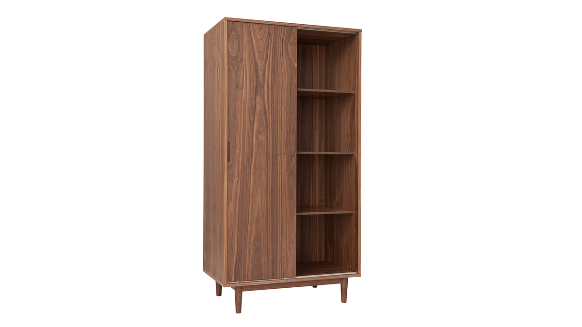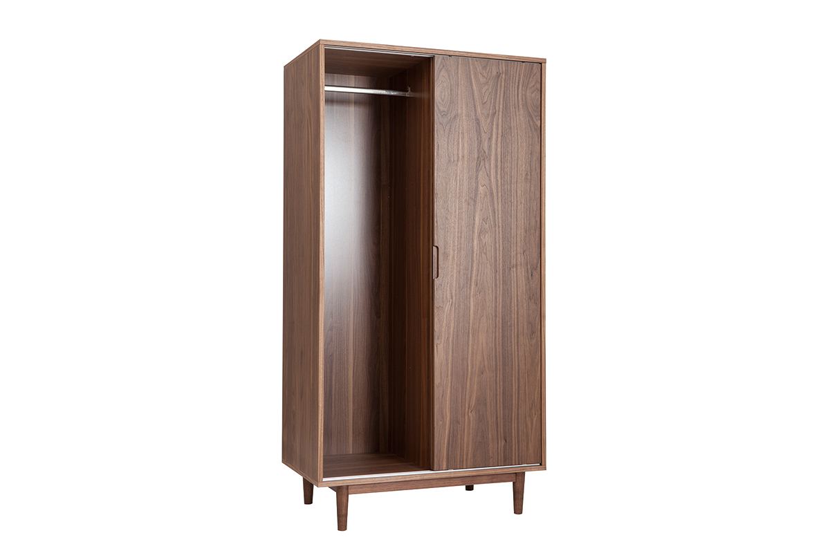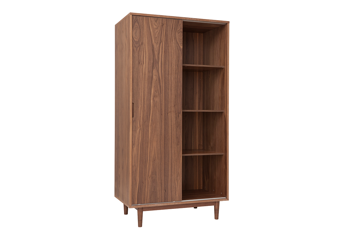 Une silhouette intemporelle à l'esprit pratique ! Véritable gain de place, les portes coulissantes - aux poignées minimalistes intégrées - renferment une penderie (L44.8 x P52.5 x H162 cm) et une étagère composée de quatre niches (L44.3 x P52.5 x H40 cm). Parfaite pour accueillir vos vestes, des vêtements, des boîtes à chaussures ou du linge de maison, la structure en panneaux de fibres de bois placage noyer et les quatre pieds en hévéa massif teinté noyer assurent robustesse et pérennité.