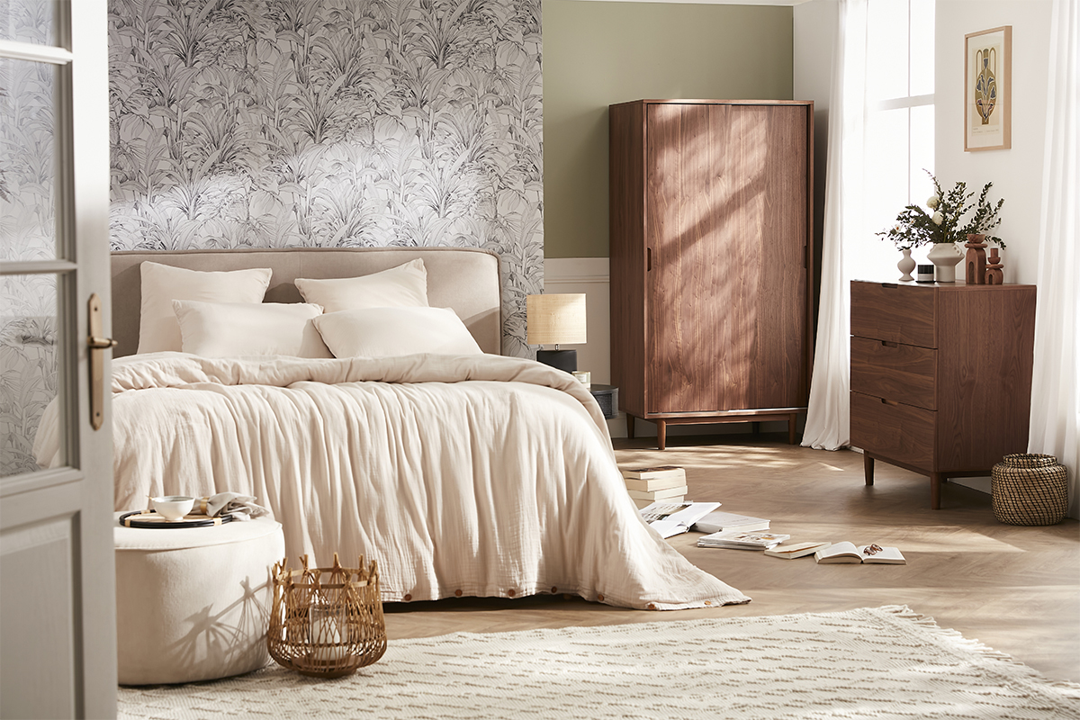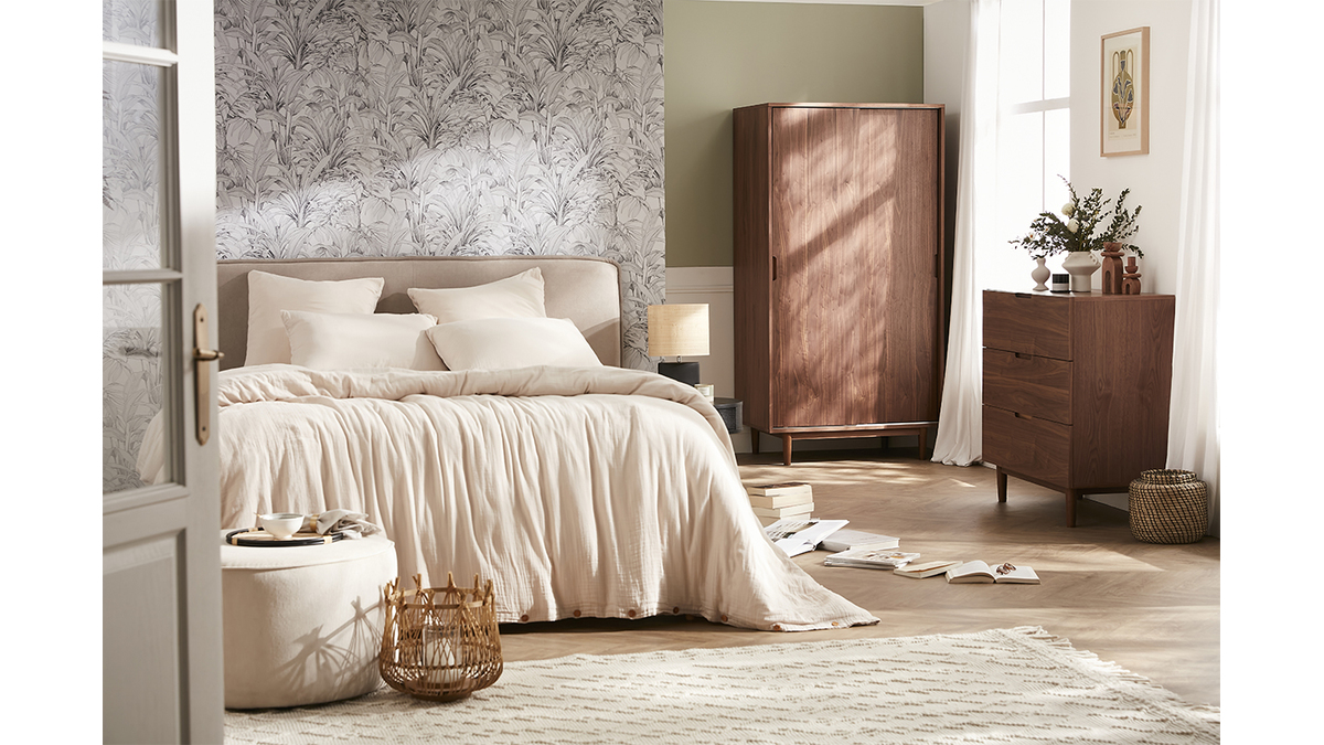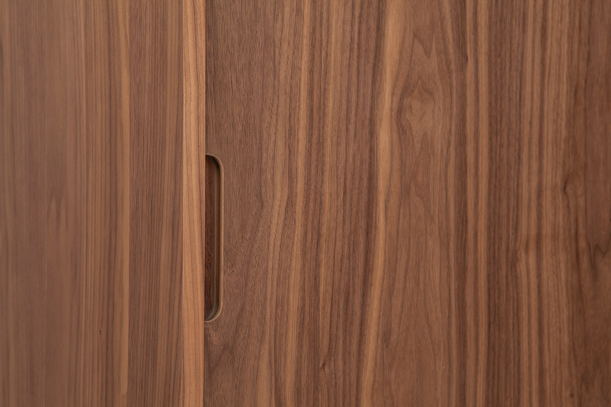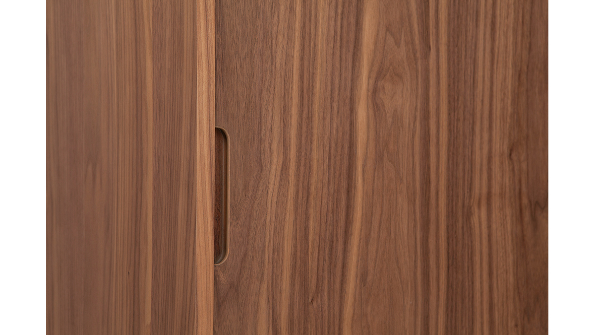 Pour concevoir la gamme ARGAN, j'ai voulu revisiter les codes des années 50 avec les pieds fuselés et le bois foncé. L'armoire ARGAN s'ouvre avec ses deux grandes portes coulissante laissent apparaître une partie penderie et une deuxième partie avec des étagères. L'armoire est accompagné de la commode ARGAN