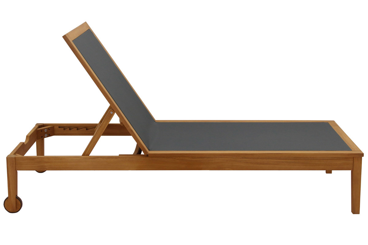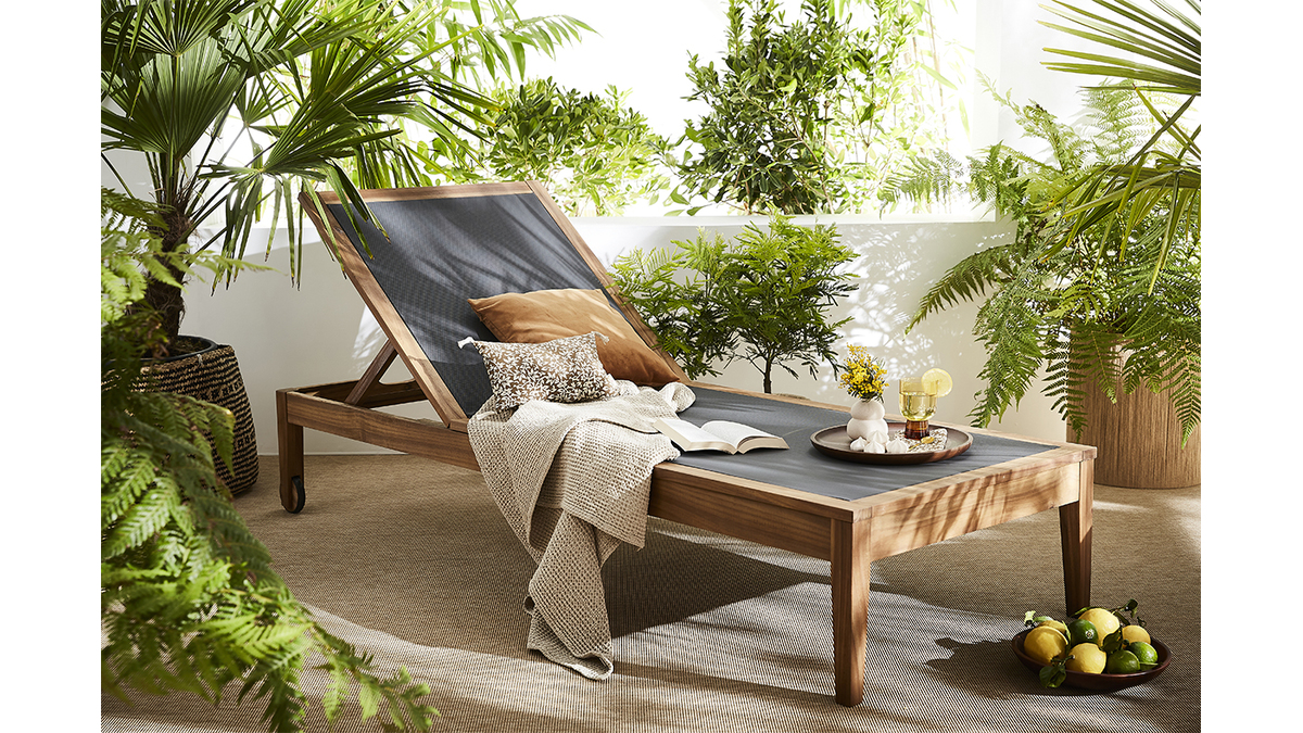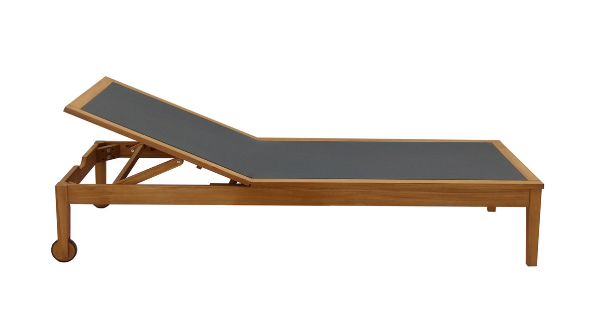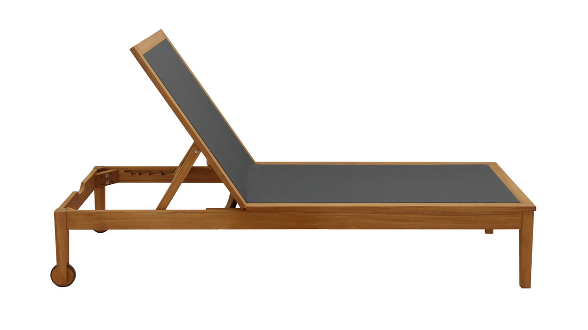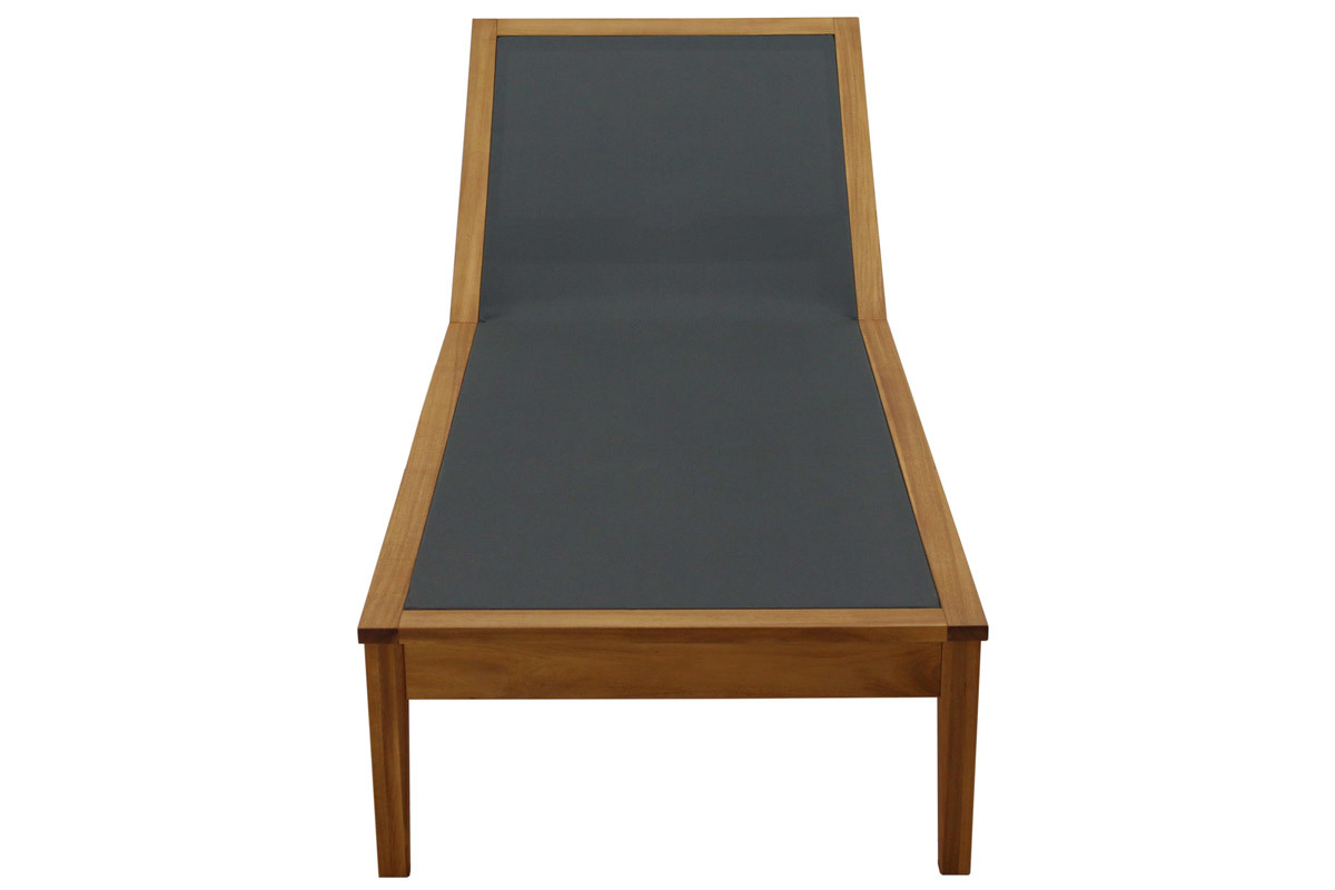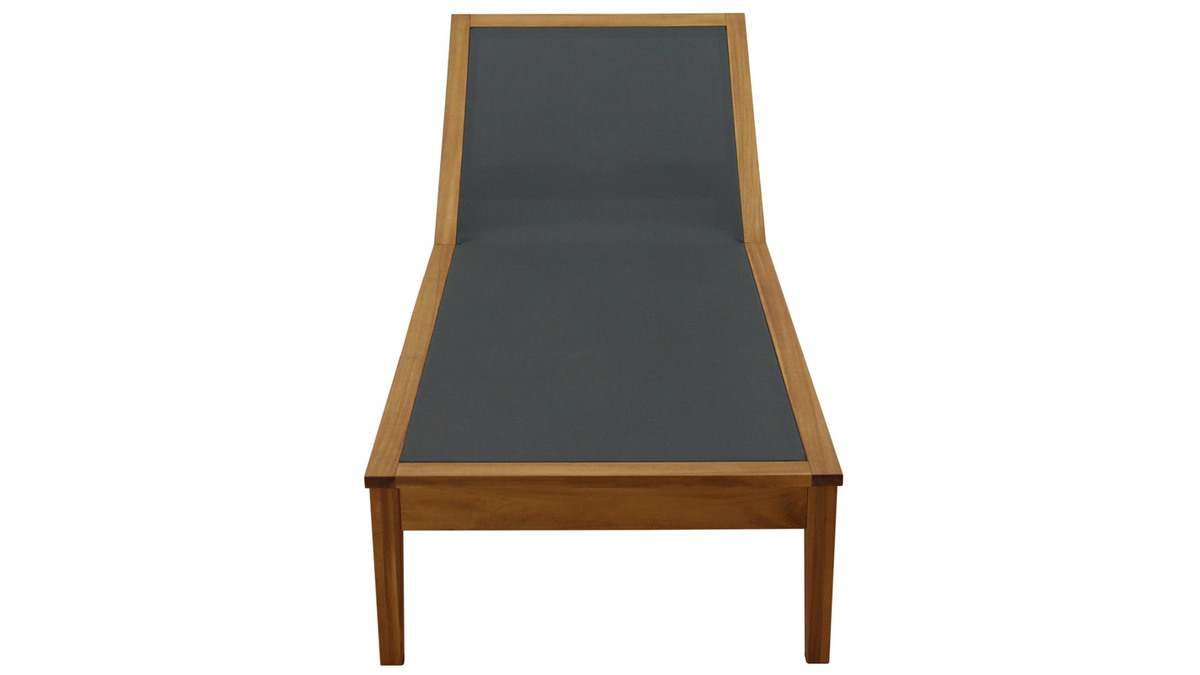Pour vivre dehors au rythme du soleil, le transat est un indispensable de saison qui sent bon les moments de farniente ! Formes harmonieuses et esprit minimaliste signent avec élégance un design intemporel qui séduira le plus grand nombre. Outre pour son esthétisme, ce bain de soleil en bois massif et toile gris anthracite se distingue par sa facilité d'entretien, son grand confort, mais également sa robustesse. La structure en acacia massif s'habille d'un revêtement textilène à la fois souple et d'un excellent soutien. Ces matériaux privilégiés pour le mobilier outdoor s'utilisent sans contraintes lors des périodes estivales.