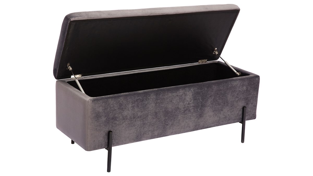 ADONIS est un bout de lit fonctionnel et tendance. Son assise est recouverte d'un luxueux tissu velours gris foncé dont le toucher est doux et agréable. On aime ses belles courbes et son revêtement tout doux qui lui donnent un esprit raffiné et glamour. Travaillé tout en finesse et en légèreté, le piètement tubulaire en métal noir complète harmonieuse cette assise d'inspiration rétro.