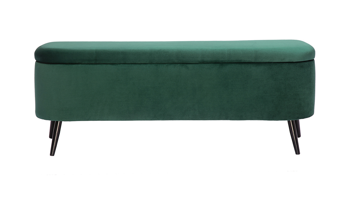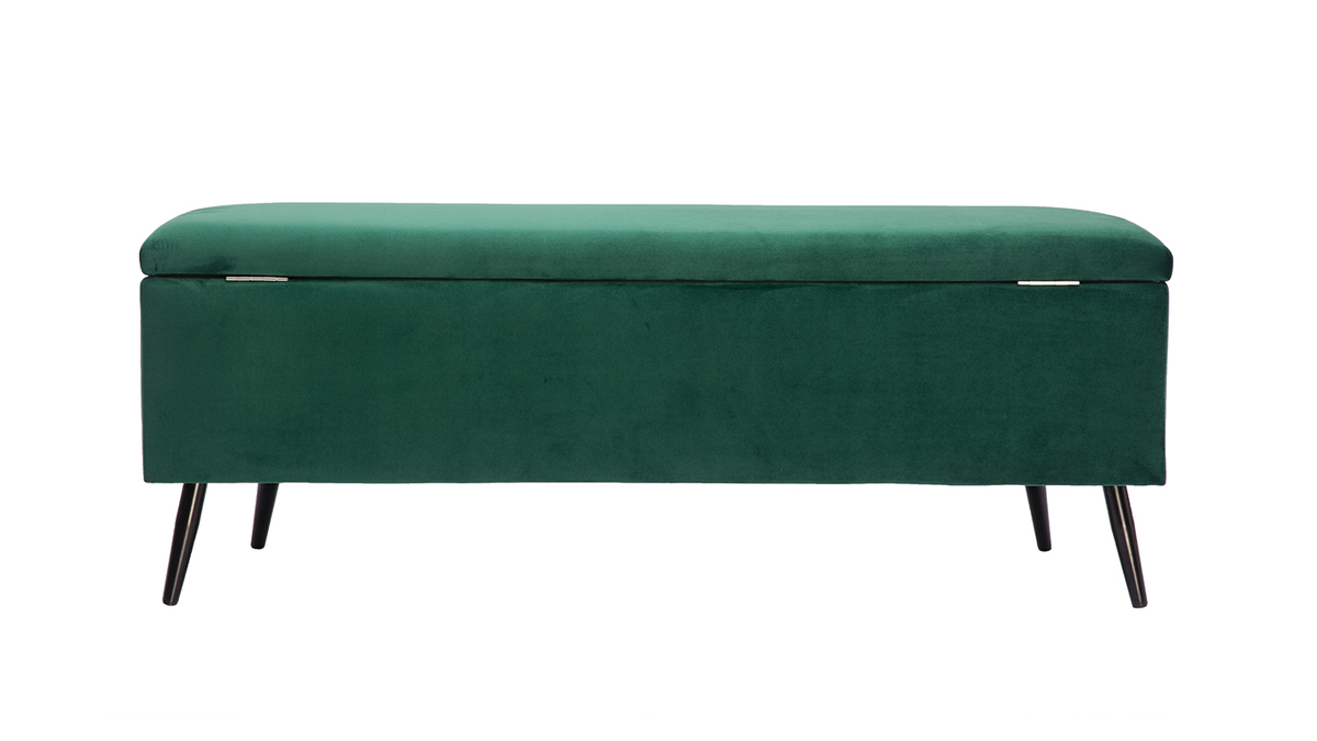Avec sa ligne courbe et son magnifique revêtement en tissu velours vert, ce banc d'intérieur design affiche un look rétro plein de charme. Cette assise au chic incontestable est supportée par quatre pieds en métal noir. Travaillés tout en finesse, ils apportent une touche de légèreté à cet ensemble résolument glamour. Toute l'élégance de ce banc coffre sera parfaitement à sa place dans une entrée, en bout de lit dans une chambre ou en assise d'appoint dans le salon.