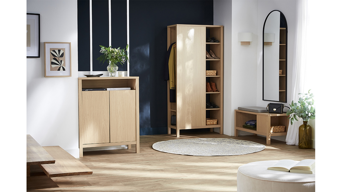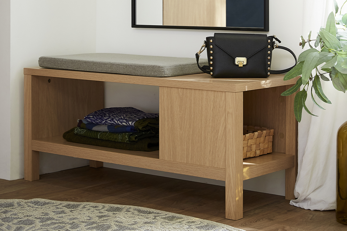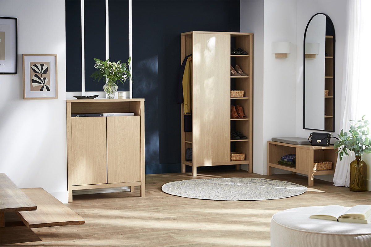 Camille PAQUEREAU, designer Miliboo, vous propose d'insuffler une touche d'épure dans votre vestibule grâce au banc d'entrée GUMBY !
