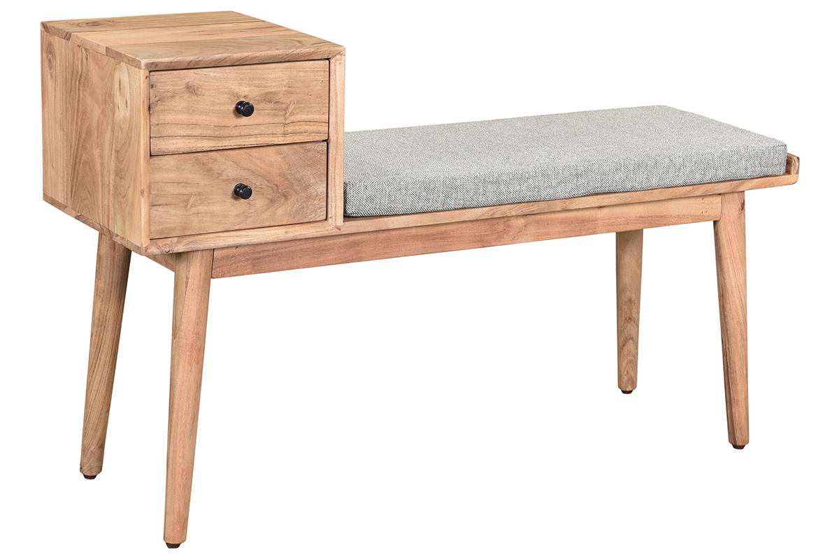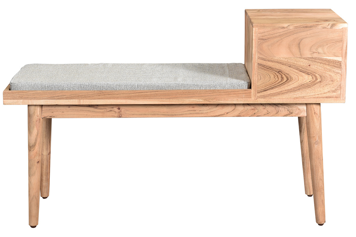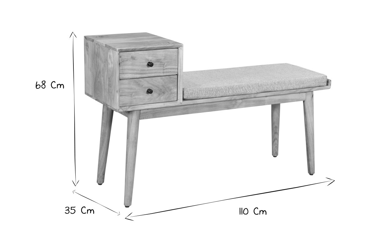 Ce banc d'intérieur est inspiré des banquettes téléphone vintage. Conçu en acacia et tissu gris, ce banc avec rangement offre un rendu plein de charme et de caractère. L'association de ces deux matériaux chaleureux donnera à la pièce un style authentique et tendance. Plébiscitée pour la confection de mobilier d'intérieur, l'acacia est une essence naturellement dure et dense particulièrement esthétique. Ce bois imputrescible, se distingue par ses veinures allongées, mais également ses variations de couleurs. Avec le temps, l'exposition à la lumière et sources de chaleur, l'acacia est un bois clair dont le coloris jaune-vert à doré subit une coloration naturelle (brune, rougeoyante, reflets gris).
