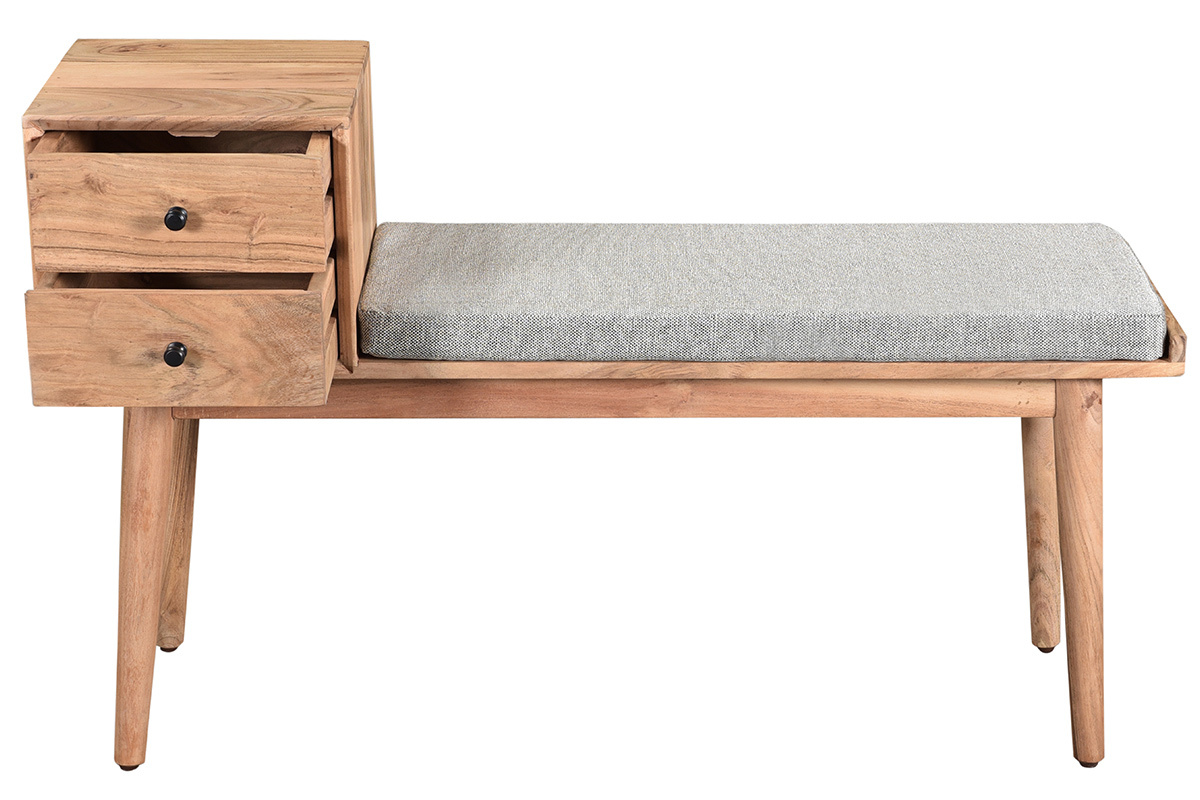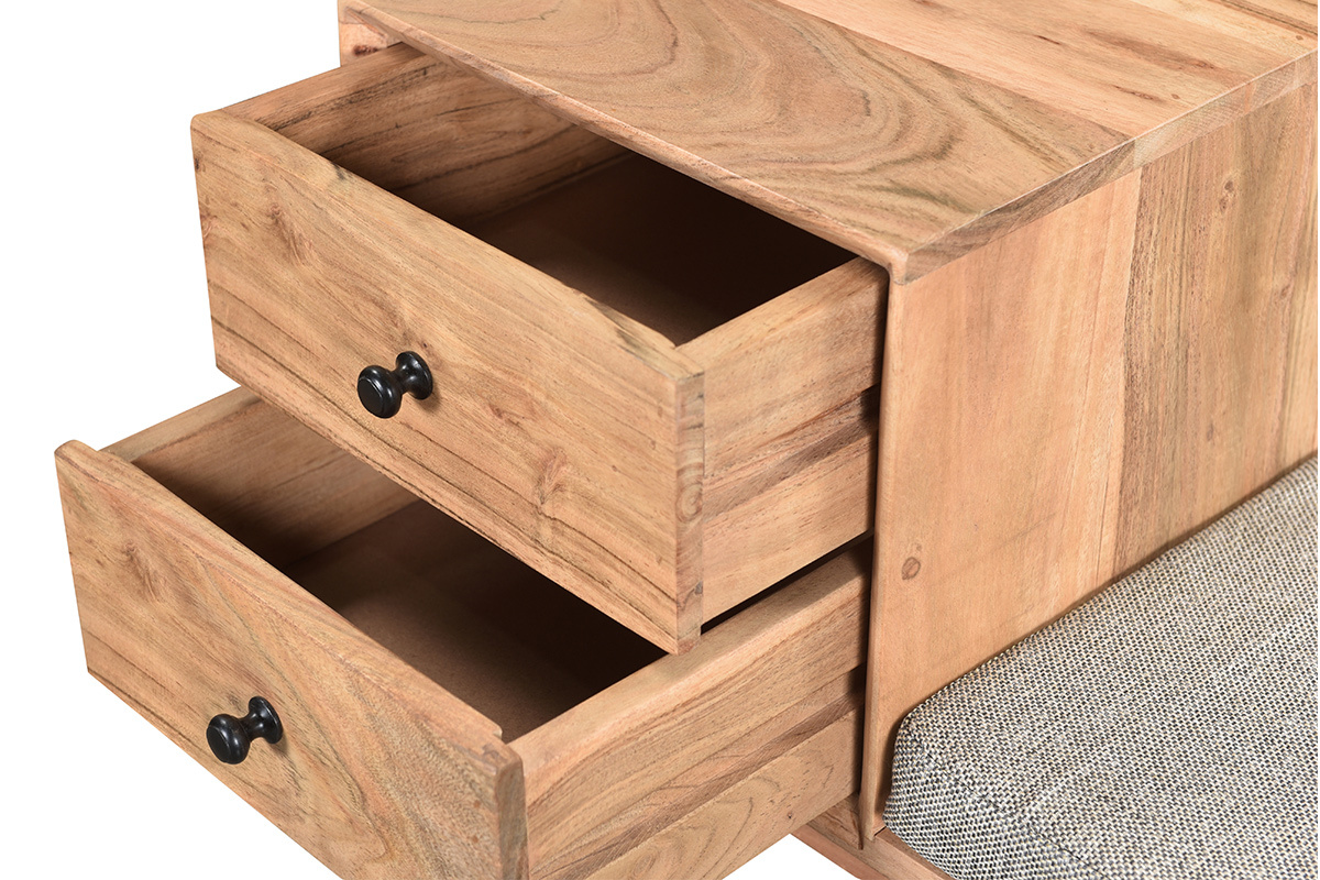 Ce banc en bois massif est idéal pour optimiser une petite entrée : on profite d'un banc avec coussin rembourré pour se chausser et de deux tiroirs latéraux pour garder toutes ses affaires à portée de main. On l'associe à un meuble de rangement pour chaussures pour un hall des plus accueillants et toujours bien apprêté !