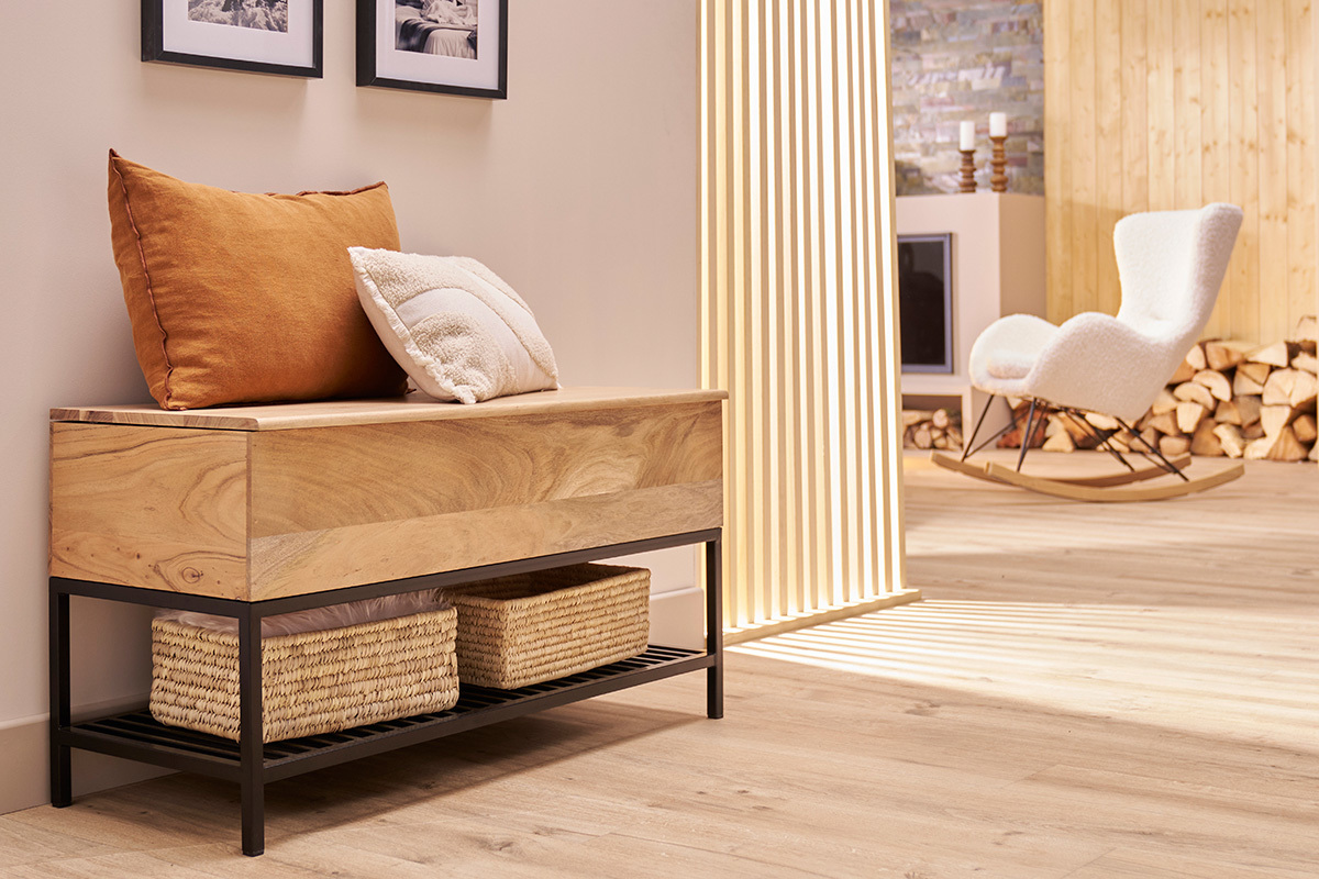 Astuce déco : en complément du banc d'entrée SORG, délimitez l'espace et créer une ambiance chaleureuse avec un joli tapis.