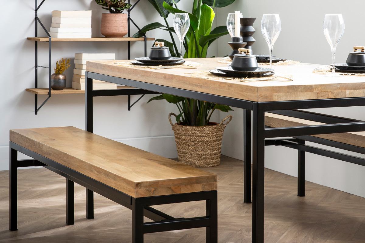 Conçu en manguier, ce banc d'intérieur possède une structure en métal noir. Son look 100% industriel saura créer une ambiance typée à votre pièce.