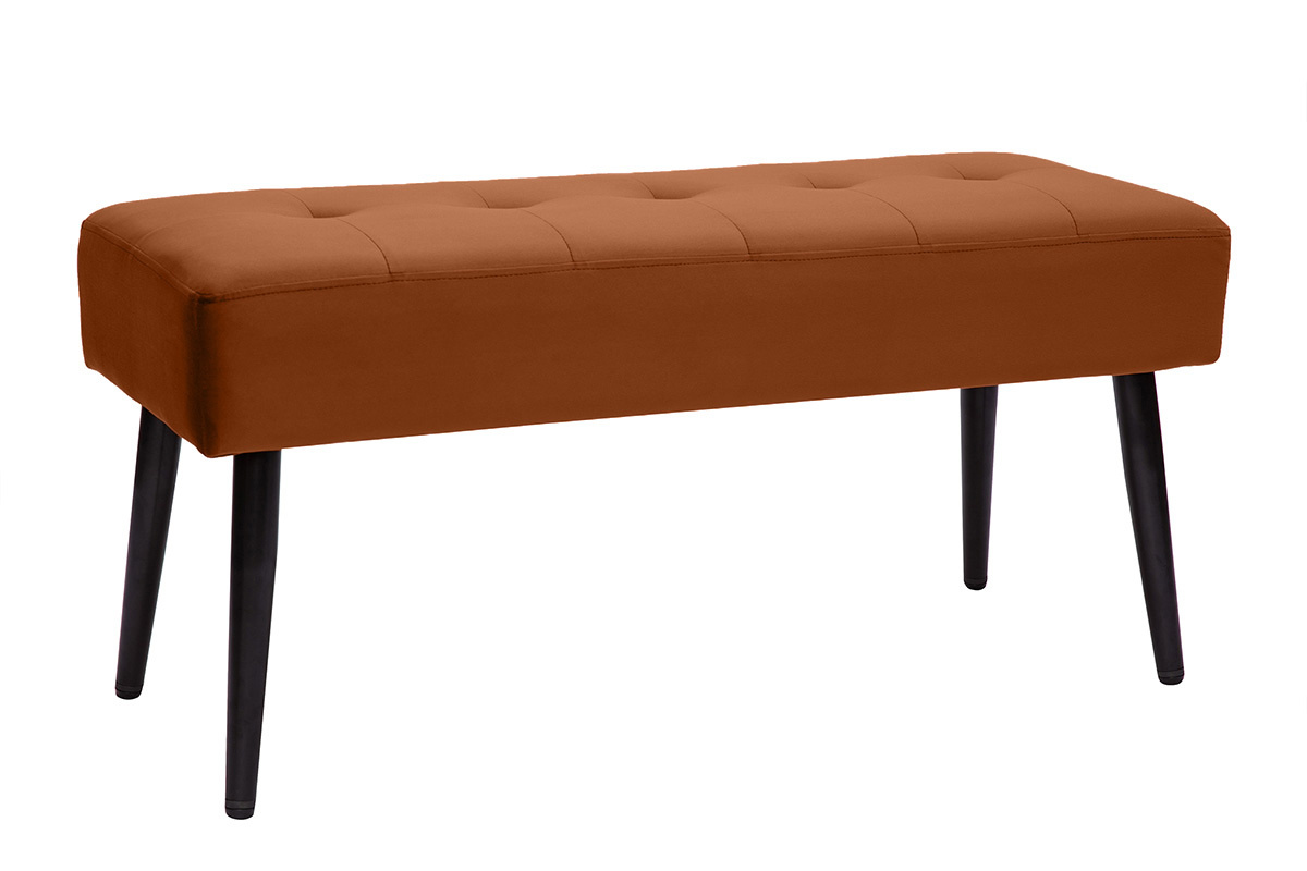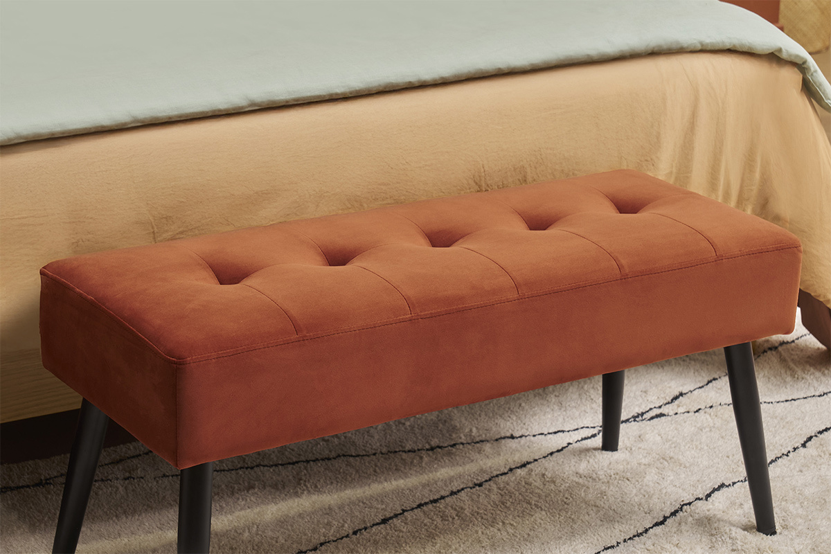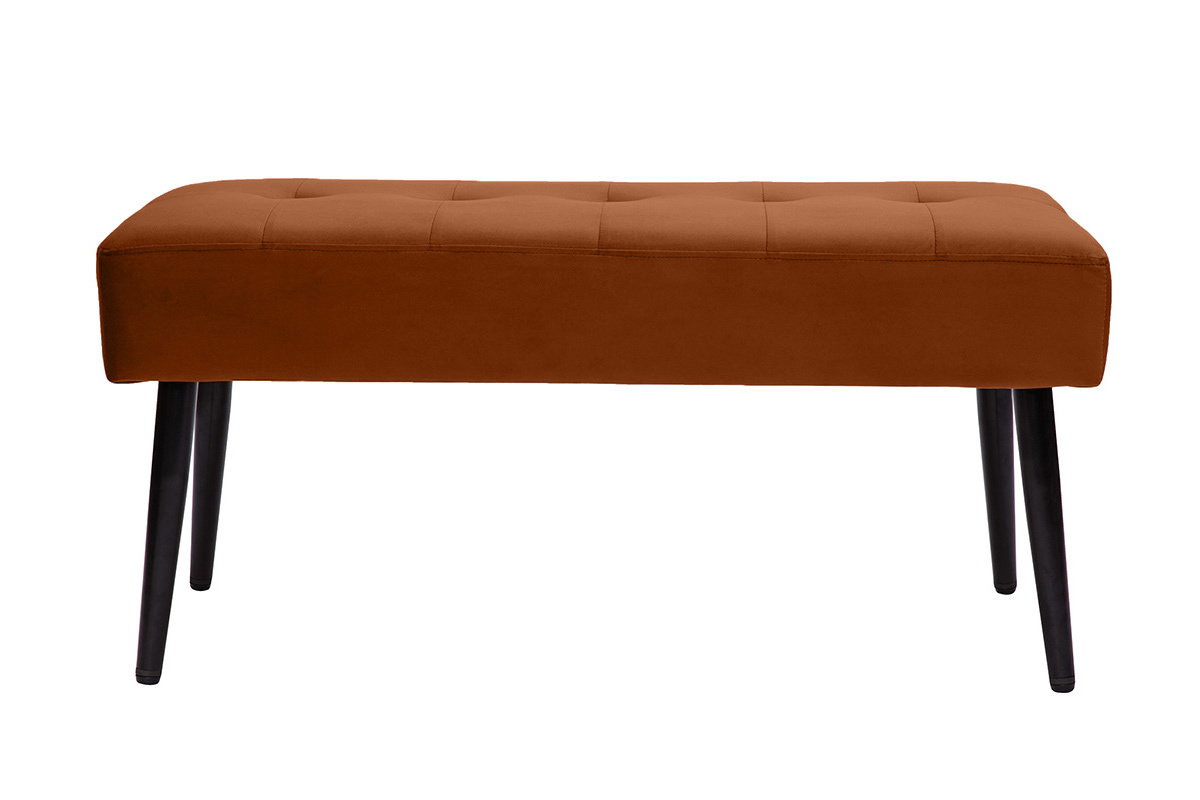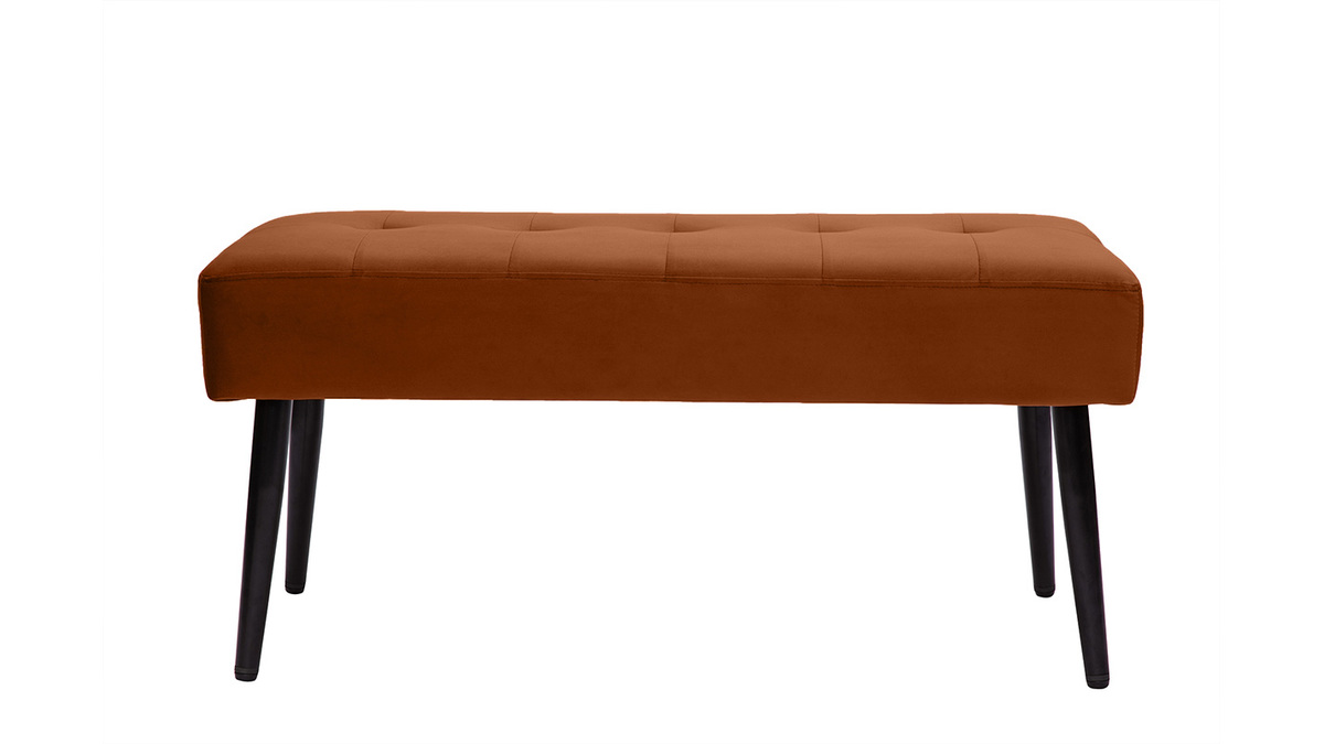 Ce banc se distingue par son velours d'une grande douceur, son coloris intense ainsi que son capitonnage... Chicissime ! La confortable assise est dotée d'un épais rembourrage en mousse polyuréthane (densité 25 kg/m3). Avec son style délicieusement fifties, le piètement fuselé en métal noir apporte beaucoup de légèreté.