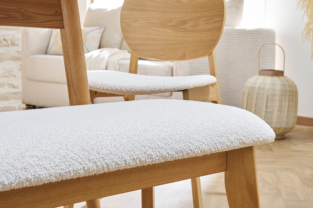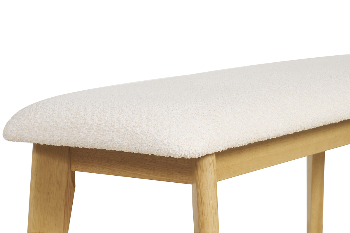 Aussi esthétique que fonctionnel : la structure et le piètement en hévéa massif vous promettent robustesse et stabilité, sublimée par un revêtement bouclette en tissu 100 % polyester au toucher très agréable, l'assise garnie d'une mousse moelleuse se veut très confortable.