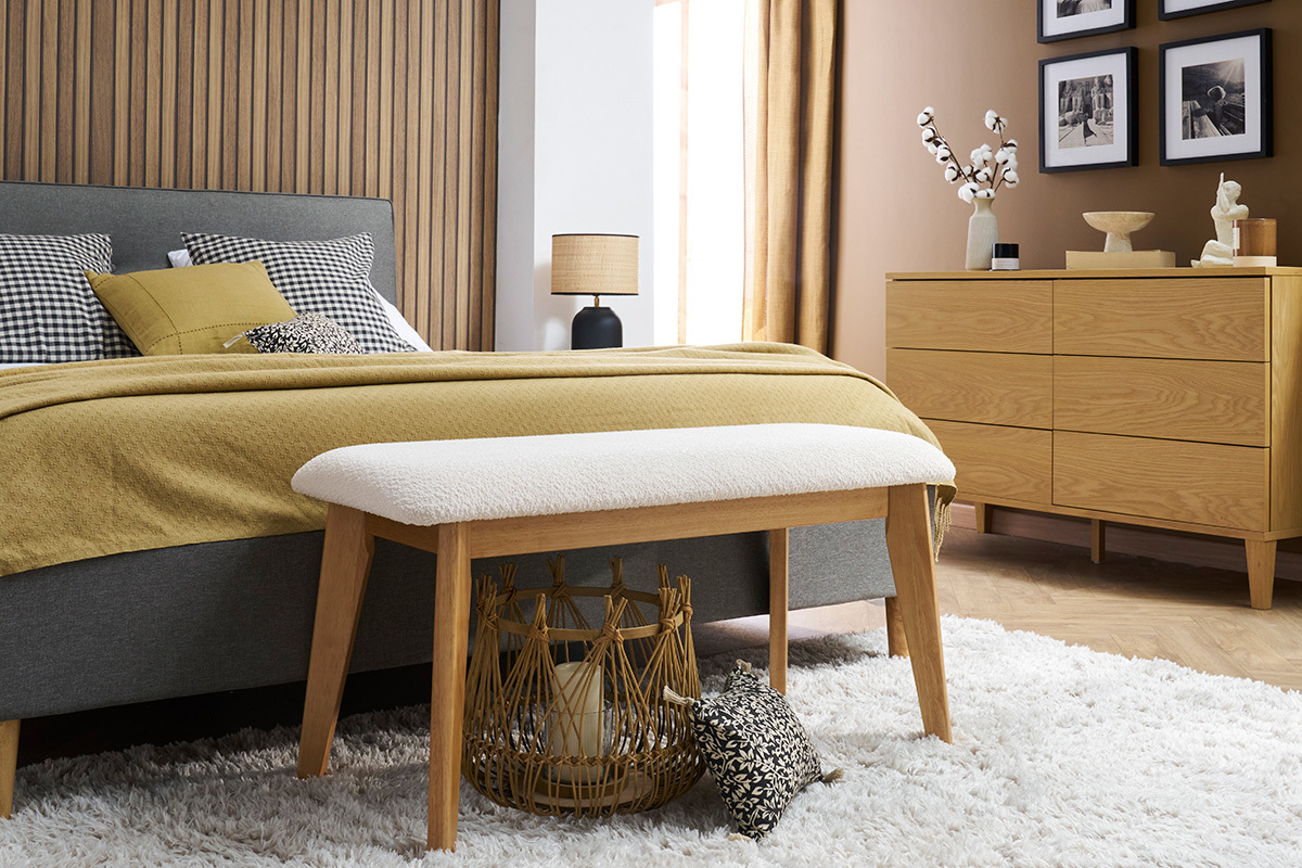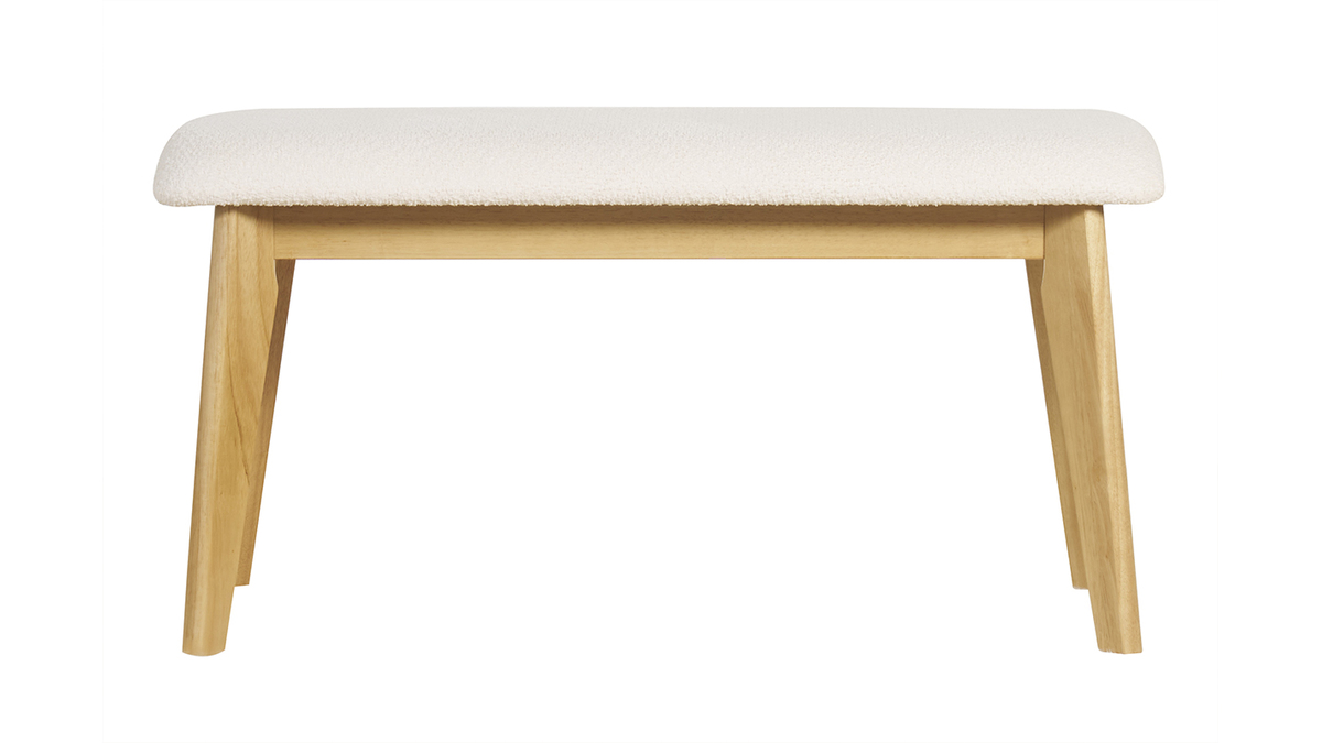 Inspiré du design scandinave des années 50, ce banc d'intérieur gris et bois conjugue avec harmonie des lignes épurées aux finitions arrondies, un piètement en bois clair aux doux reflets dorés et une assise habillée d'un élégant tissu effet laine bouclée blanc. Une silhouette apaisante et un brin rétro appréciée des intérieurs cosy.