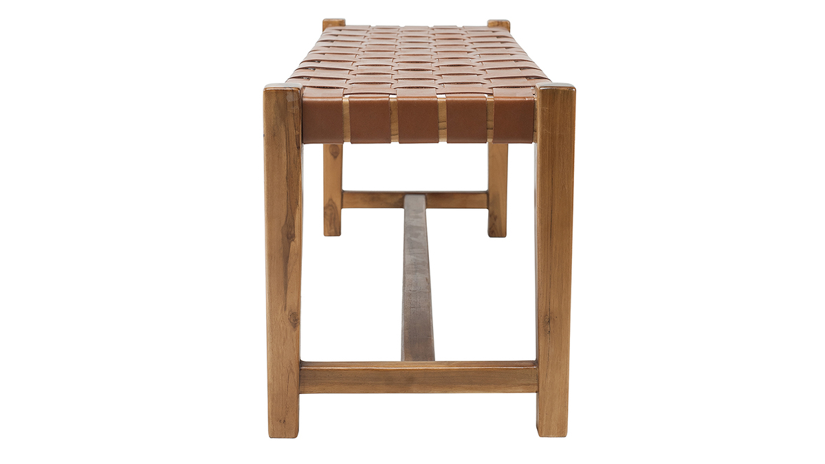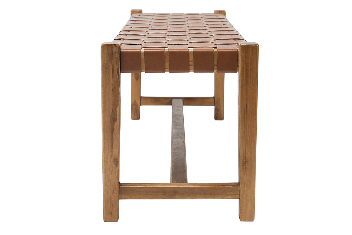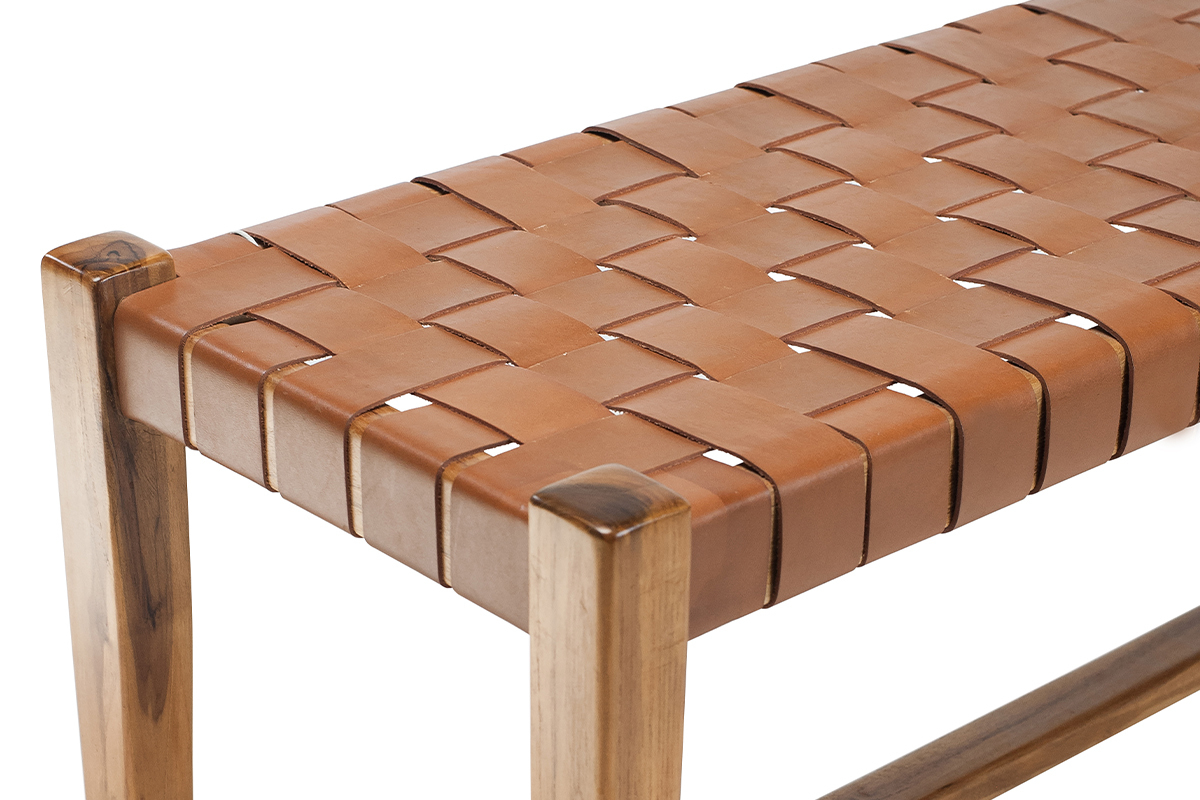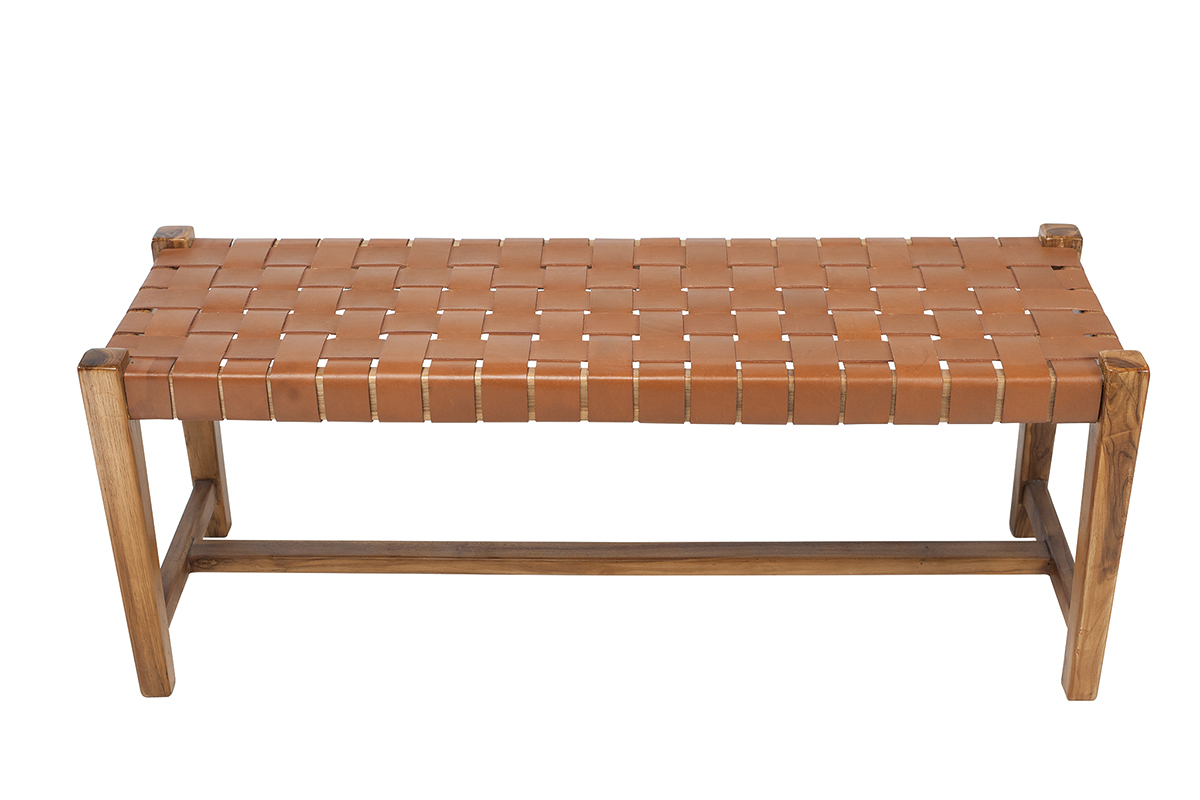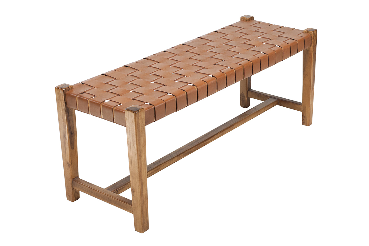 Associant teck massif et cuir de vache tressé, ce banc d'intérieur est un véritable atout déco. En plus de proposer une nouvelle façon de s'asseoir très actuelle, ce banc ethnique se distingue par sa conception et ses matériaux. C'est une pièce artisanale dont le cuir a été tressé à la main. Il est complété par une structure en teck, une essence de bois tropicale, appréciée pour ses jolies nuances et sa solidité. Ce banc marron en bois et sangles de cuir est une pièce d'exception, au charme fou.