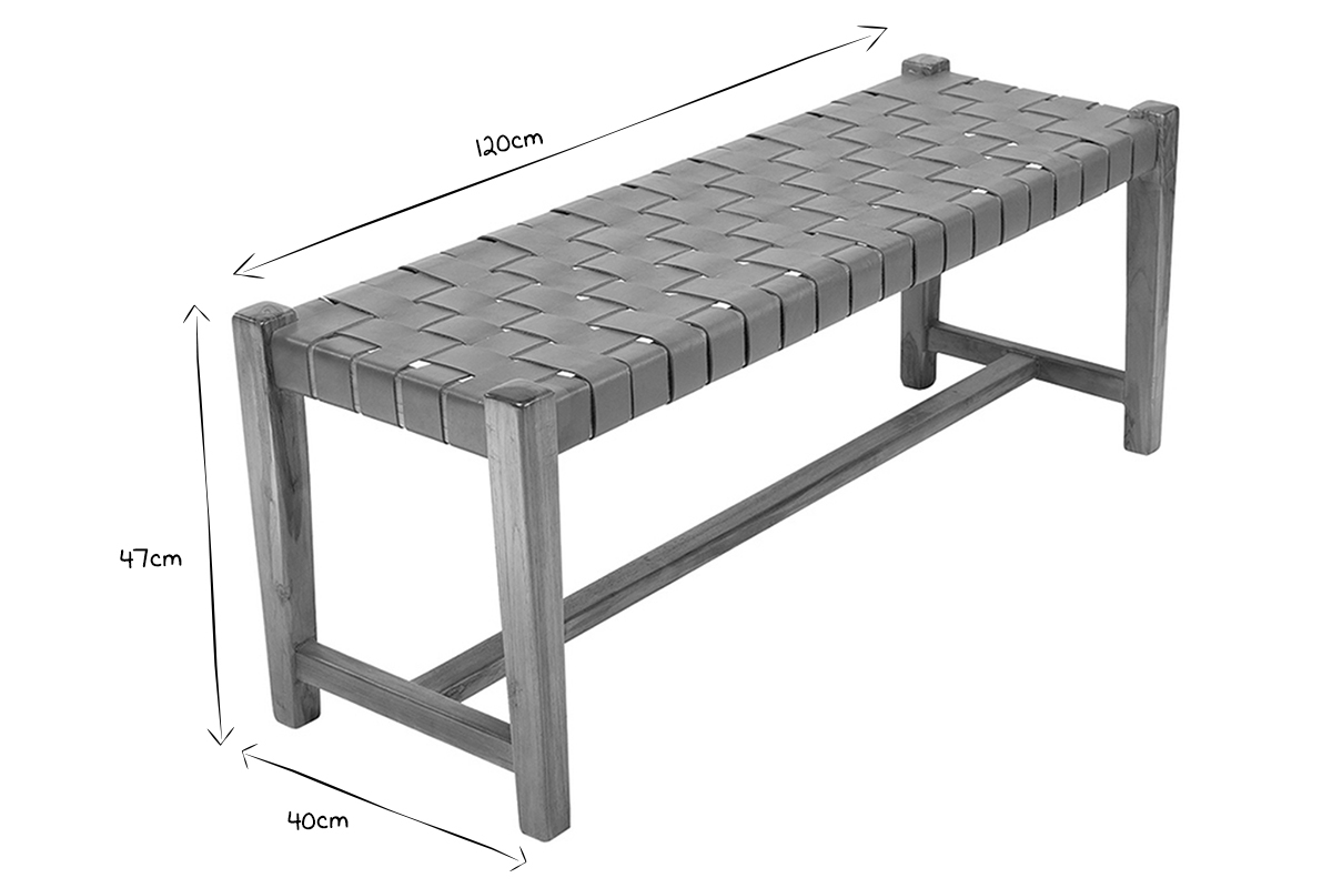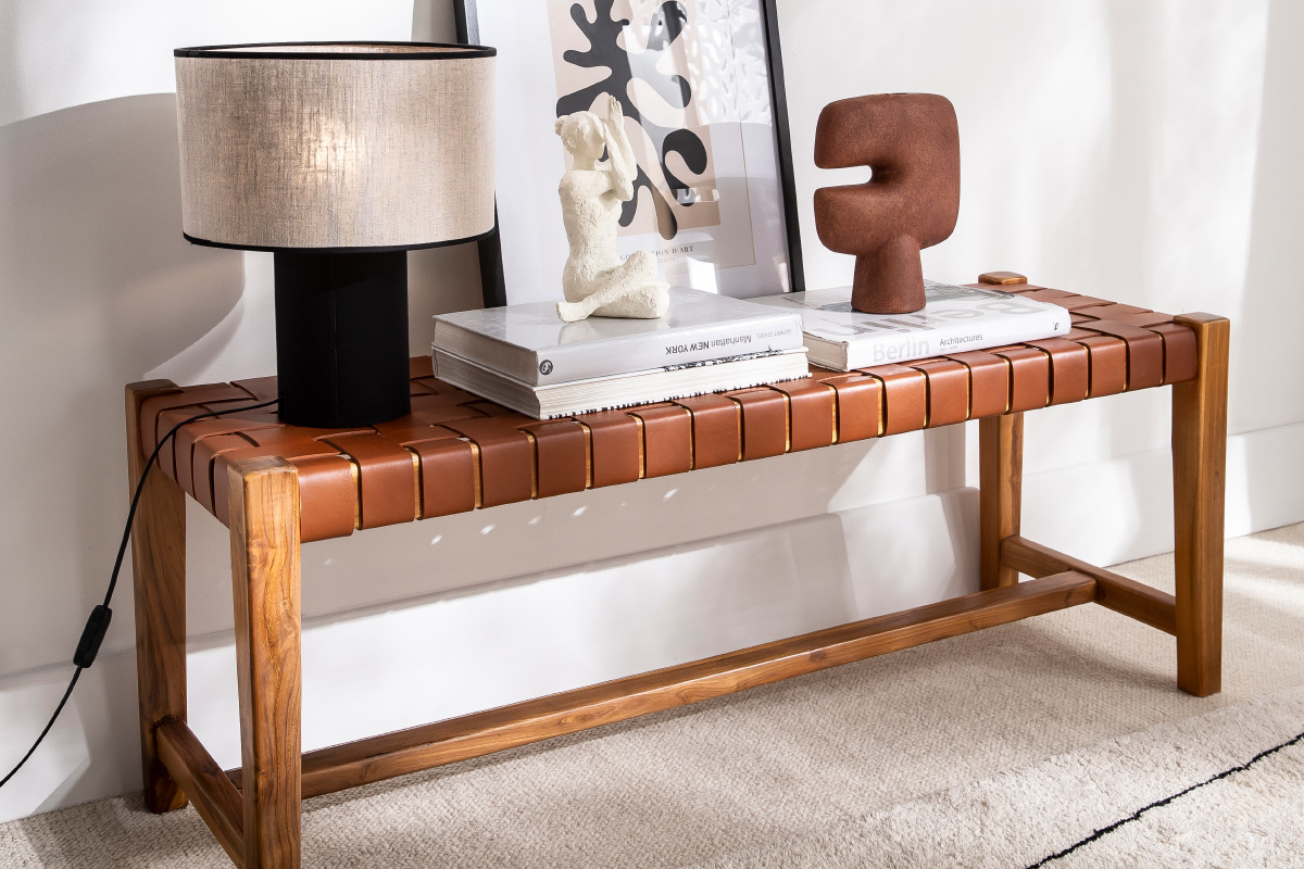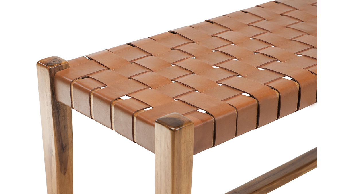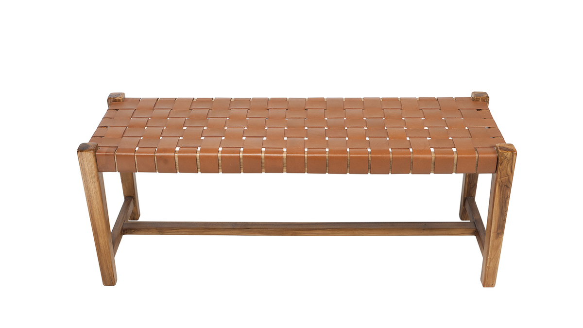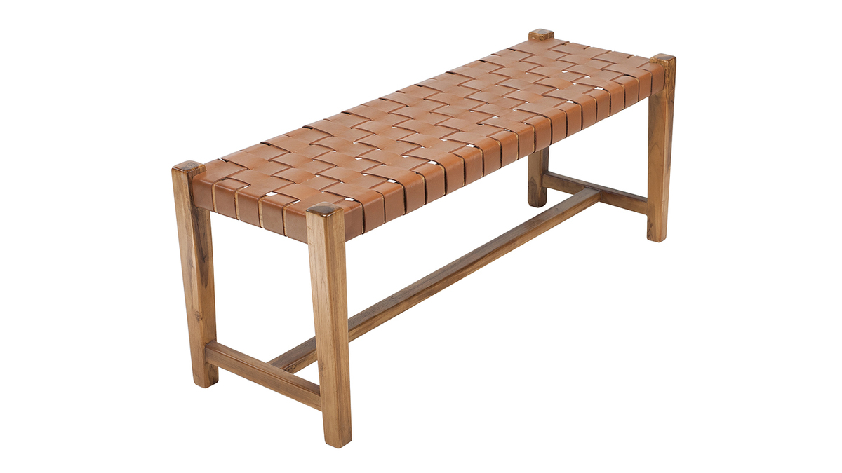 Associant teck massif et cuir de vache tressé, ce banc d'intérieur est un véritable atout déco. En plus de proposer une nouvelle façon de s'asseoir très actuelle, ce banc ethnique se distingue par sa conception et ses matériaux. C'est une pièce artisanale dont le cuir a été tressé à la main. Il est complété par une structure en teck, une essence de bois tropicale, appréciée pour ses jolies nuances et sa solidité. Ce banc marron en bois et sangles de cuir est une pièce d'exception, au charme fou.