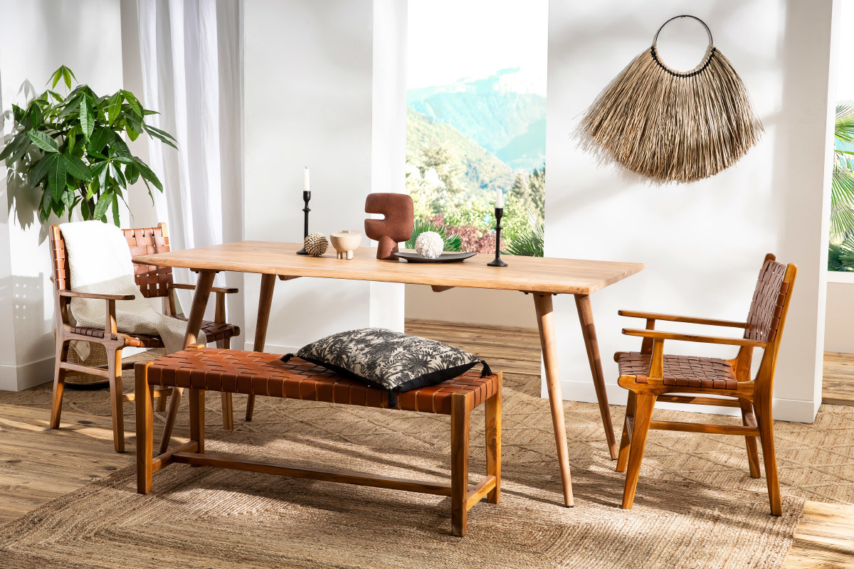 Matières : teck massif et cuir de vache