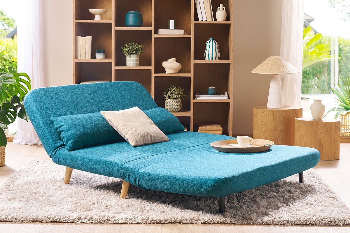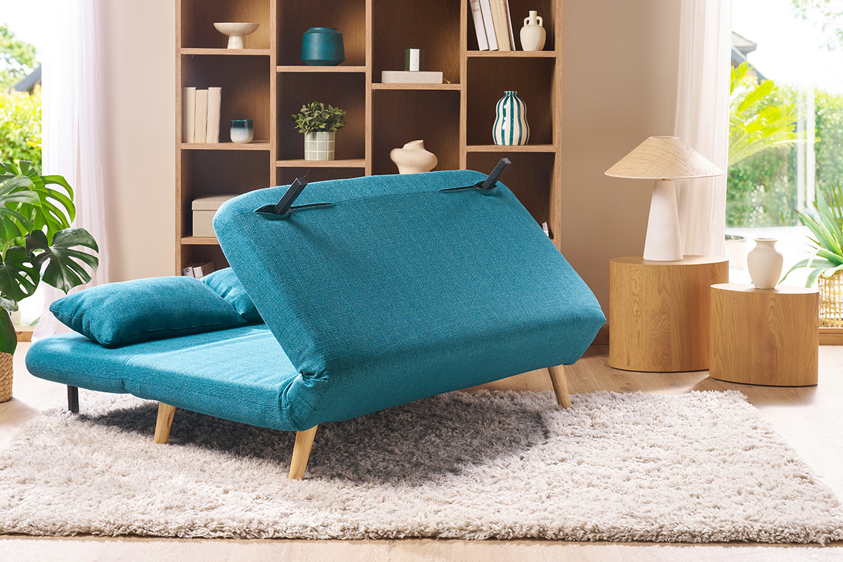 Tantôt lit, tantôt canapé, la chauffeuse 2 places convertible AMIKO transforme les petits salons en chambre à coucher.