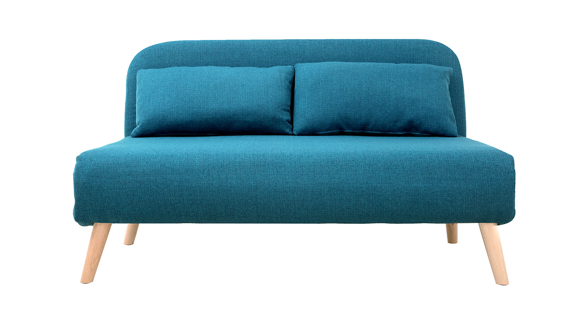Cette banquette-lit en polyester bleu canard s'adapte à tout type d'intérieur. Avec son design simple et épuré, elle convient parfaitement à des pièces à la décoration moderne ou encore scandinave. Son piétement évasé en hévéa apporte un charme unique à ce petit canapé.