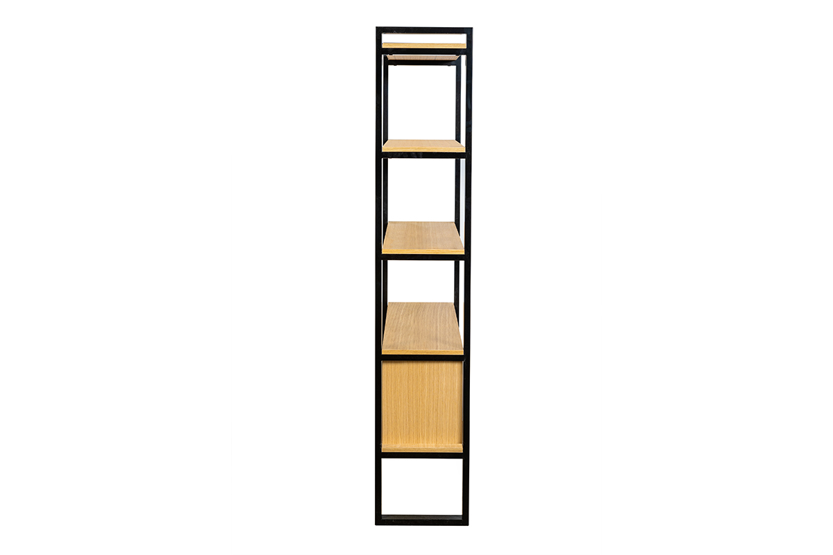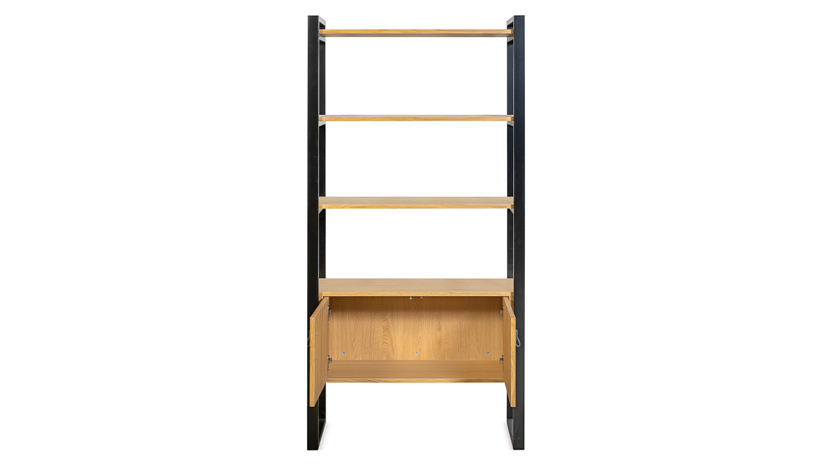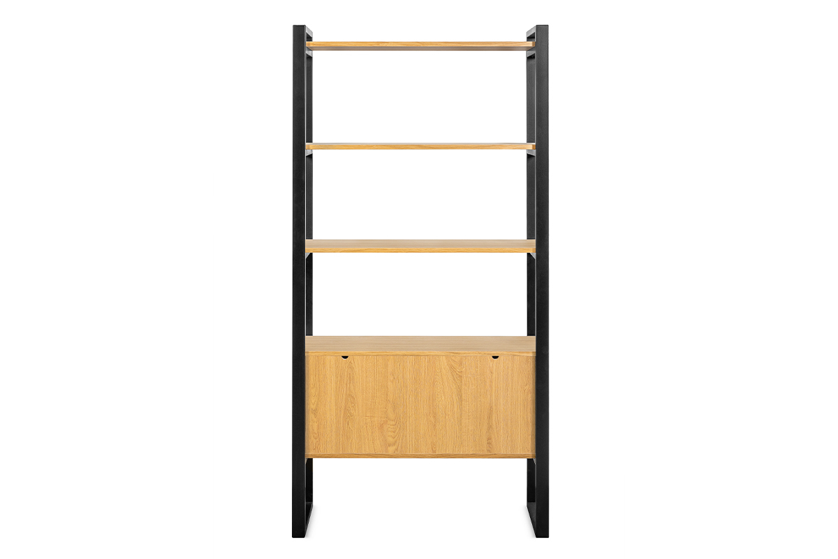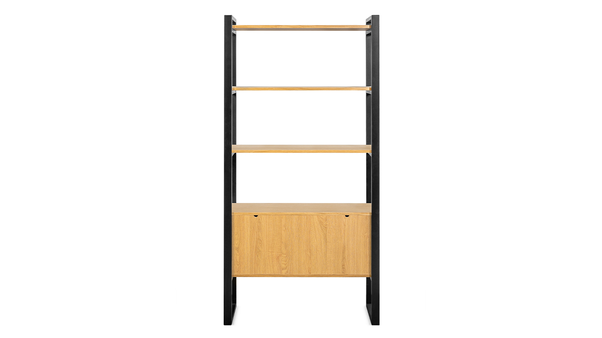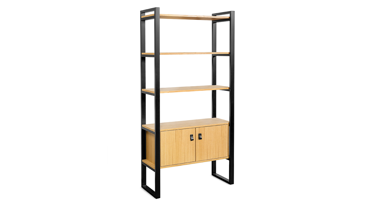 La bibliothèque OPAL véhicule une beauté brute tout en étant moderne. Ses lignes sont ultra structurées et son jeu de matière parfaitement maîtrisé ! Son caisson deux portes et ses trois étagères en panneaux de particules de bois placage chêne sont encadrés par une structure en métal noir, de quoi donner un bel accent industriel à ce meuble de rangement fonctionnel.