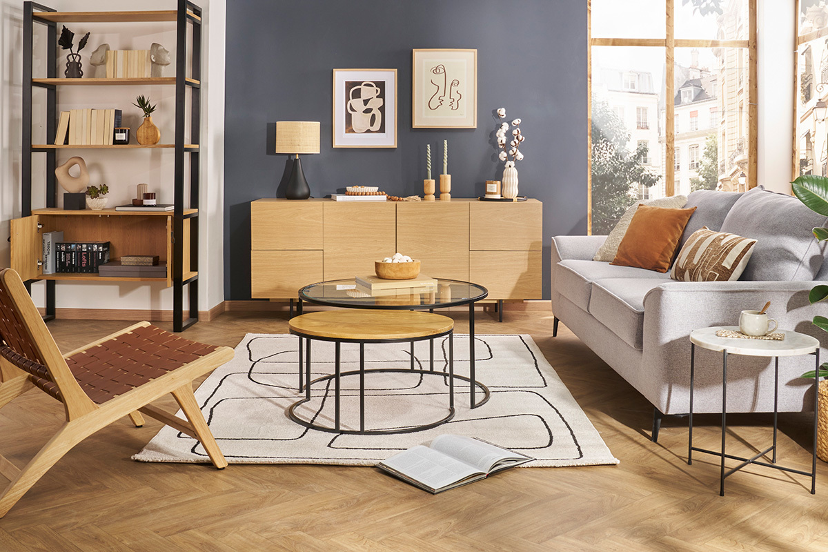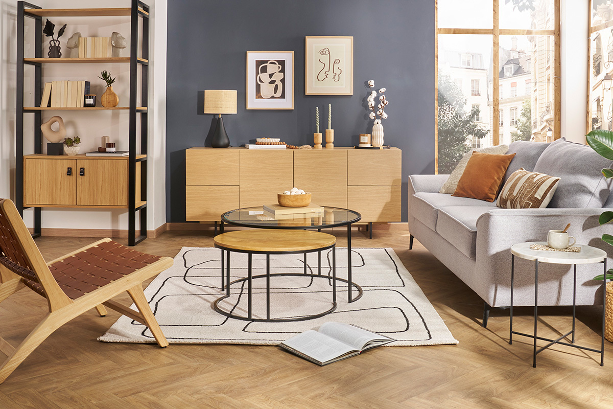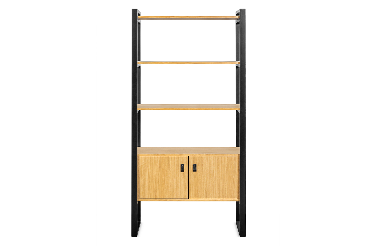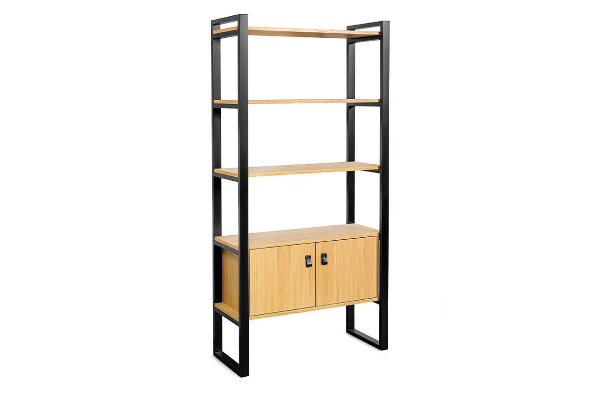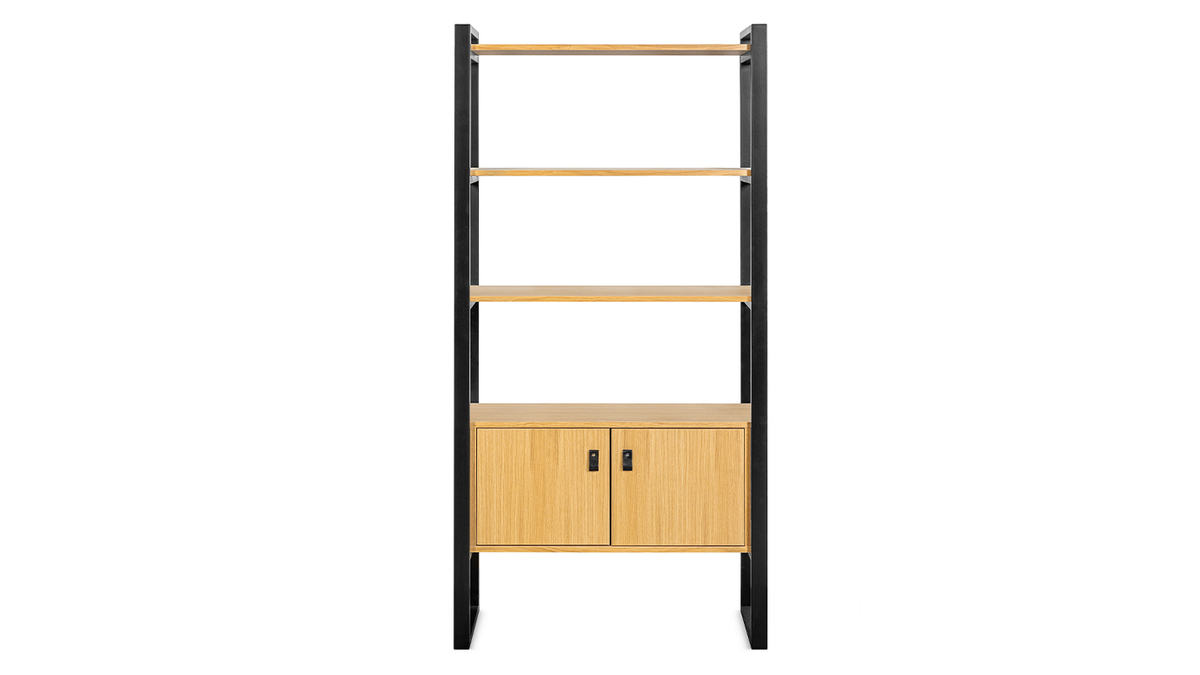 La bibliothèque OPAL véhicule une beauté brute tout en étant moderne. Ses lignes sont ultra structurées et son jeu de matière parfaitement maîtrisé ! Son caisson deux portes et ses trois étagères en panneaux de particules de bois placage chêne sont encadrés par une structure en métal noir, de quoi donner un bel accent industriel à ce meuble de rangement fonctionnel.