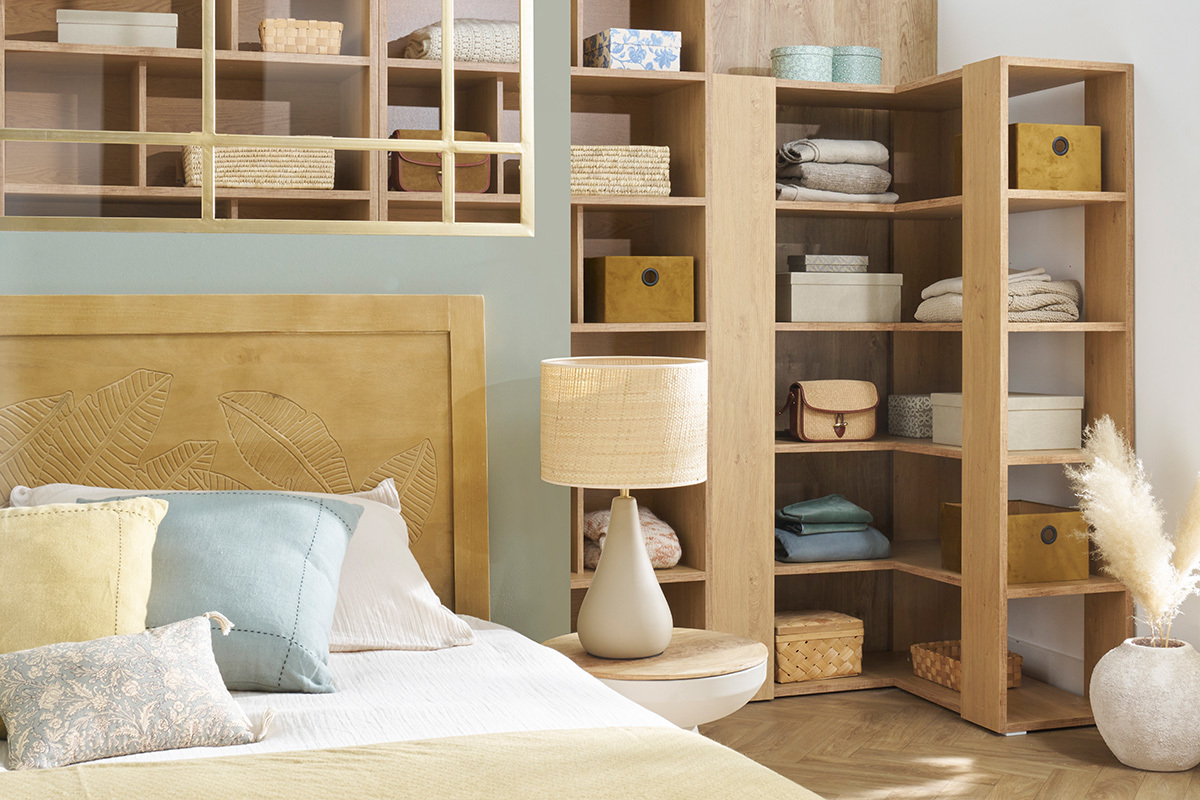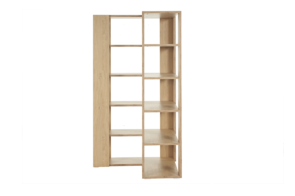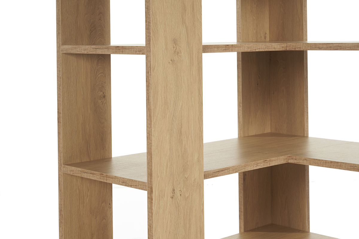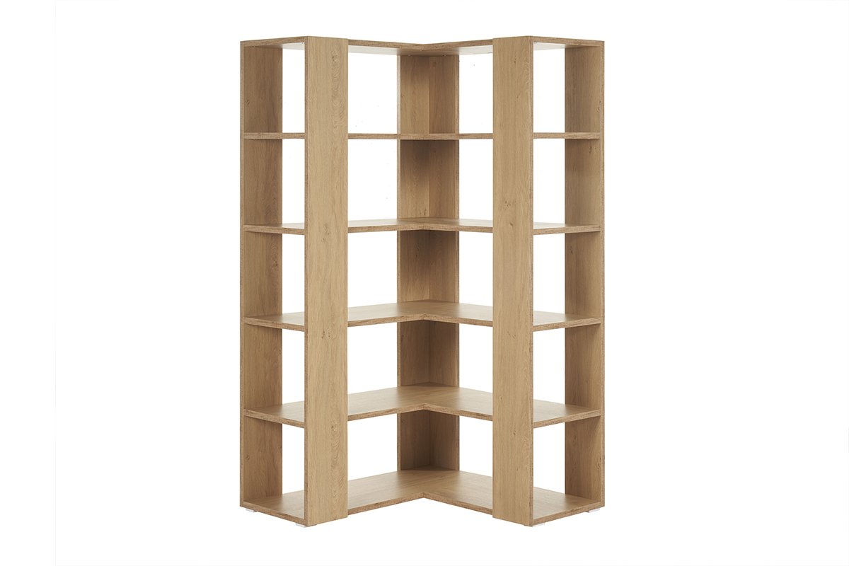 Dans un espace de travail à côté d'un bureau design ou dans le salon pour former un coin lecture, la bibliothèque d'angle finition bois clair MUSSO vous aidera à conserver votre foyer toujours bien organisé !