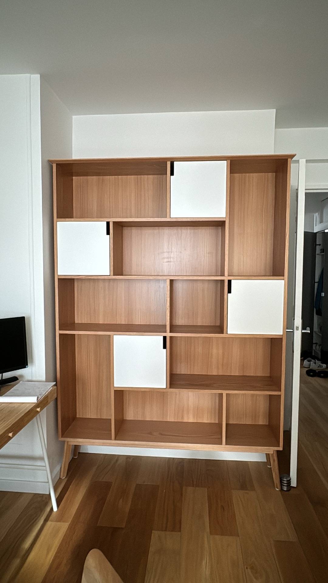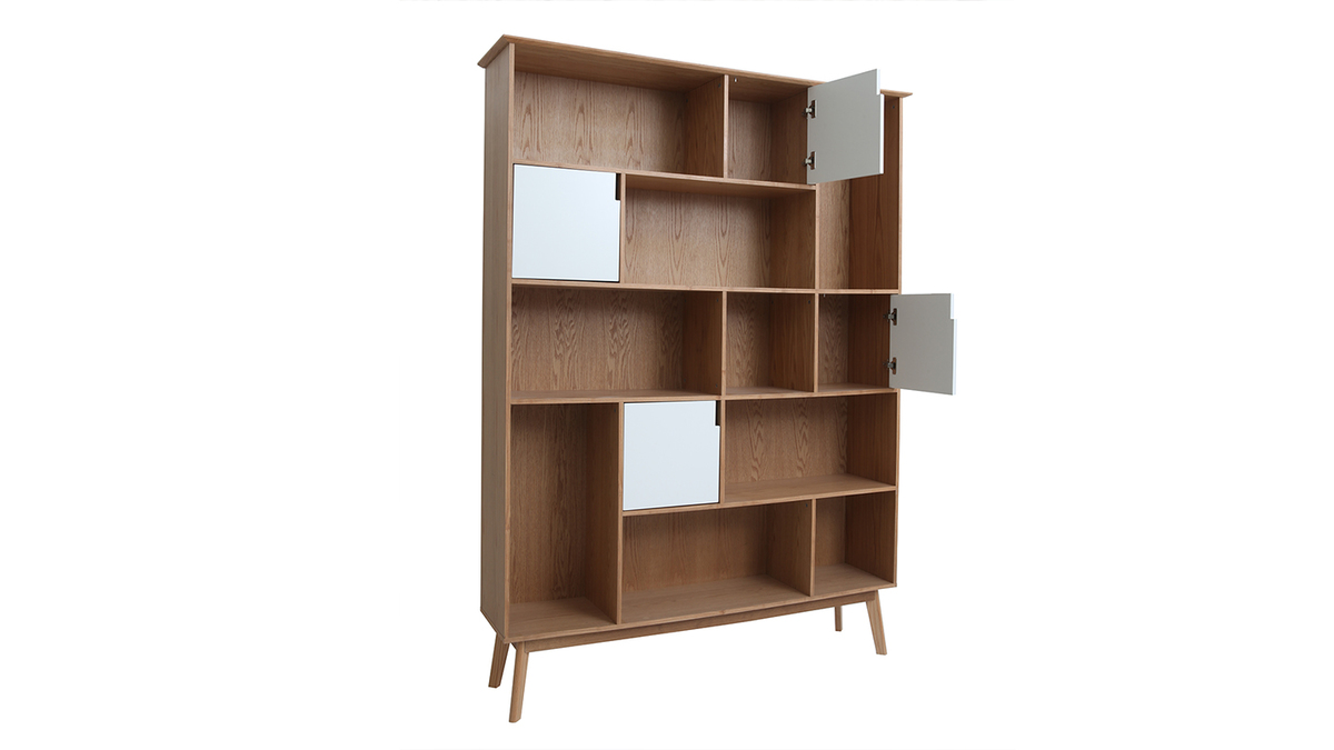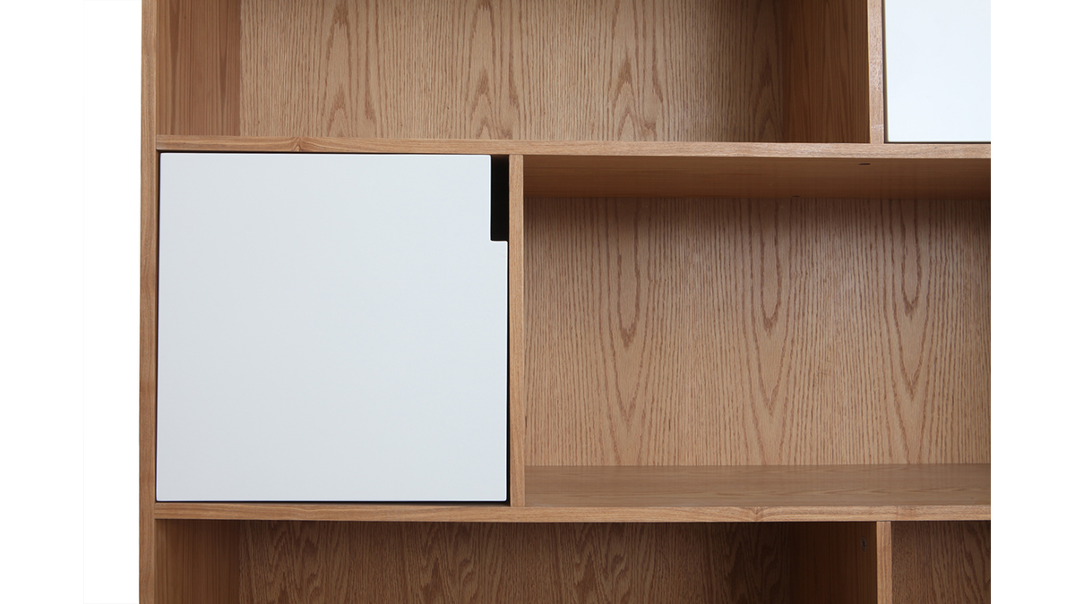 Avec ses compartiments organisés de façon atypique et ses portes blanches géométriques, cette grande bibliothèque en bois (dimensions totales L150 x P35.5 x H208.5 cm) est un objet déco à part entière. Elle mélange placage chêne (panneaux de fibres de bois) et touches de blanc pour un rendu unique et design. Ses 4 pieds en bois (chêne massif) apportent de la légèreté à l'ensemble. Elle pourra ainsi habiller les murs d'un bureau, d'un salon ou d'une chambre sans alourdir la pièce.
