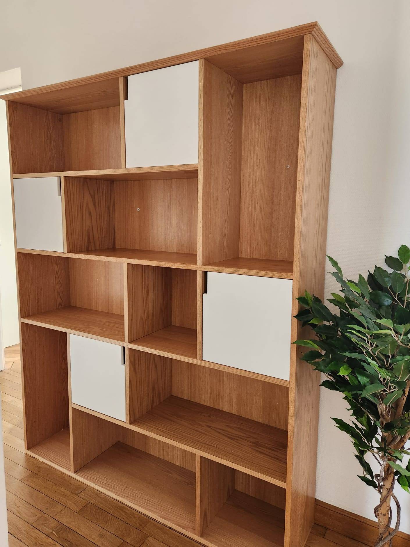 Grâce à ses casiers de différentes tailles, cette bibliothèque design blanc et bois offre des espaces de rangement fonctionnel. Livres de poche, grands ouvrages, objets déco... tous trouveront leur place dans l'une des niches. Si les 4 casiers fermés apportent une touche moderne à cette bibliothèque haute, ils sont également idéaux pour dissimuler ce qu'on ne souhaite pas laisser à la vue de tous.