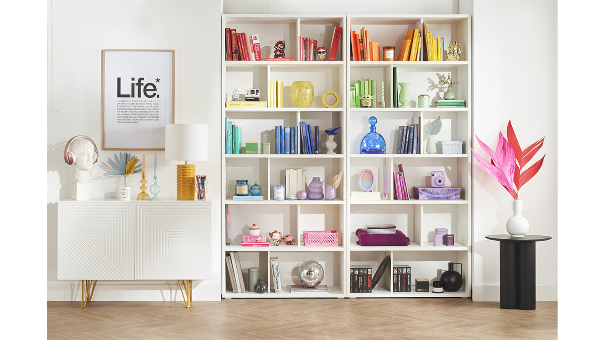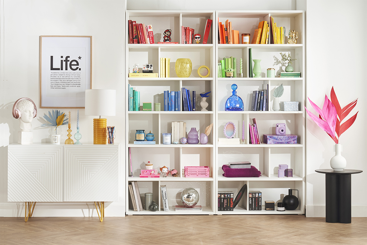 Astuce déco : atlernez paniers de rangement et accessoires comme des cadres, miroirs ou vases sur certaines étagères. Vous donnerez à cette grande bibliothèque une touche très déco !