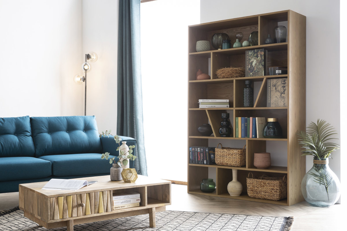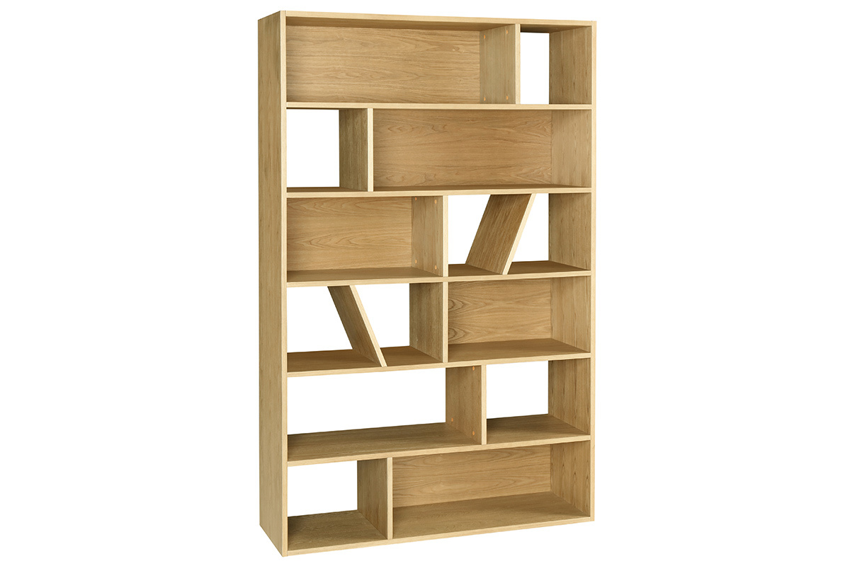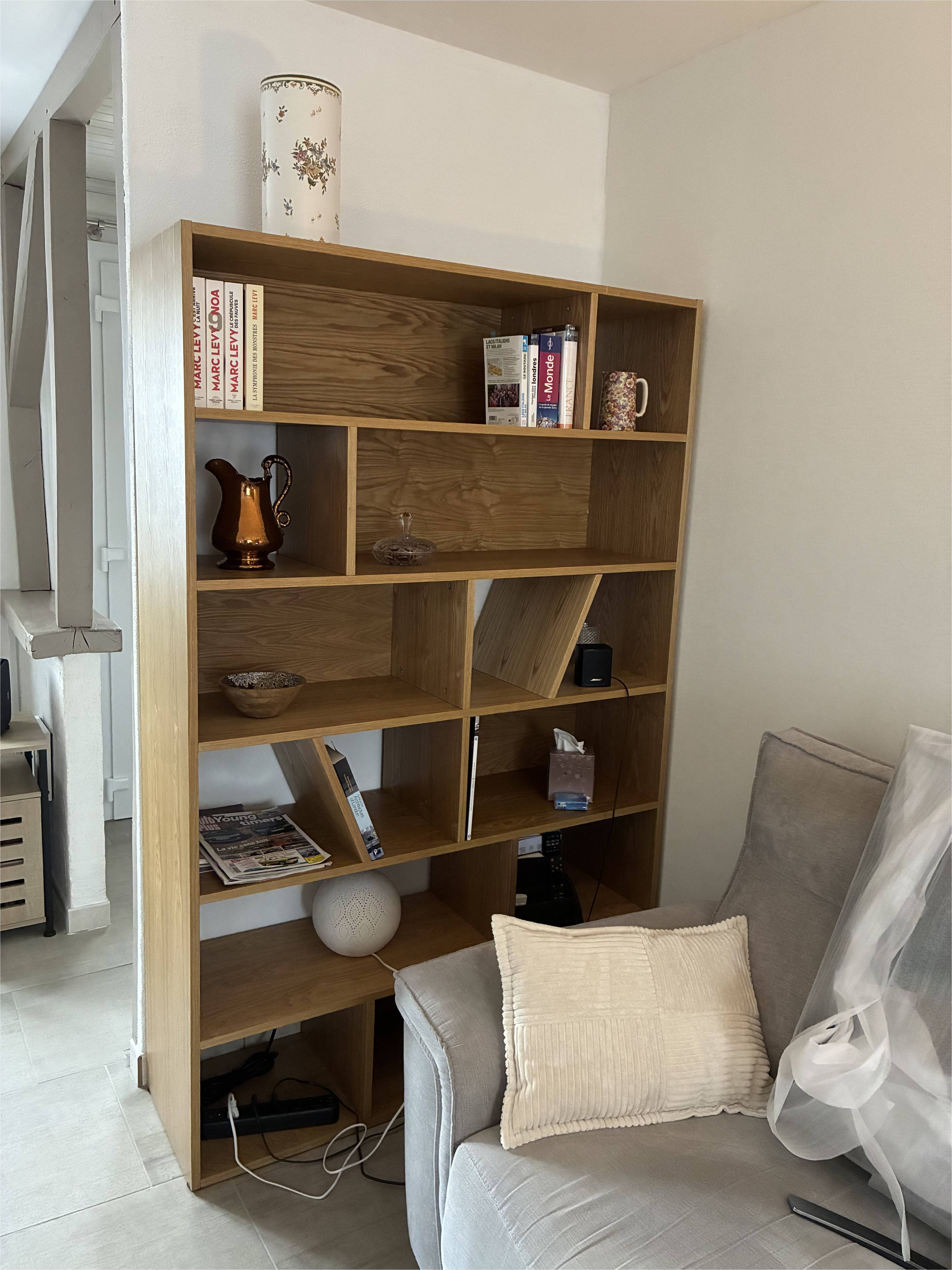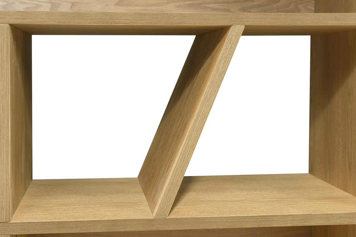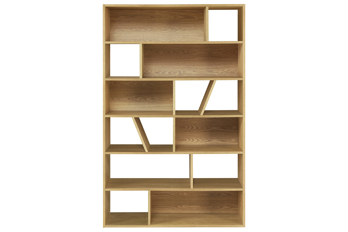 Si la bibliothèque est un indispensable de nos intérieurs, elle manque parfois d'originalité. Voilà un intemporel revisité dans une version moderne et singulière. Avec ses rangements asymétriques, ses lignes diagonales et ses niches avec et sans fond, cette bibliothèque en bois design est un objet déco à part entière. Sa finition frêne (panneaux de fibres de bois contreplaqué) permet de l'intégrer facilement dans différents styles d'intérieur.