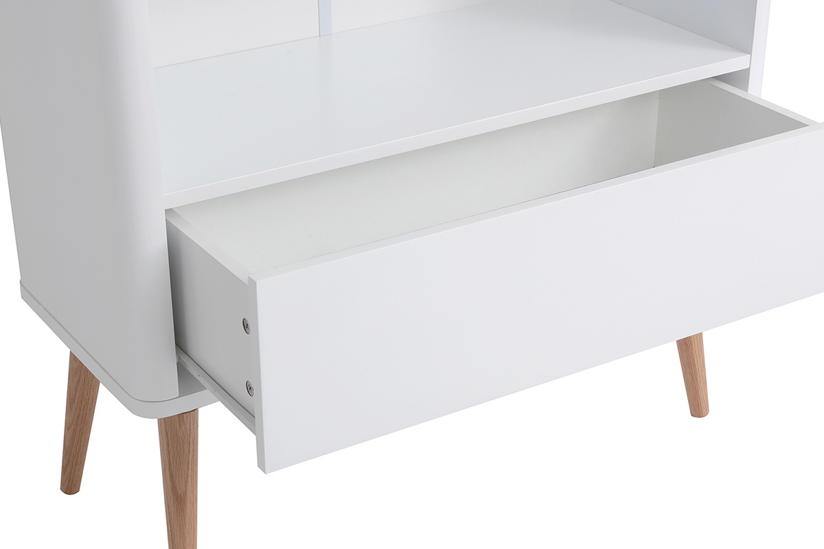 Son petit plus: la bibliothèque design scandinave possède un système push/pull pour l'ouverture et la fermeture de son grand tiroir.