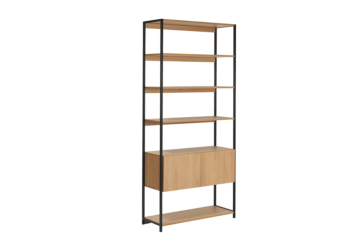 De belle facture, cette bibliothèque ouverte se démarque de ses pairs par sa structure filaire en métal noir, et ses plateaux et caisson finition mélamine chêne clair. Couleurs et textures s'animent et se subliment mutuellement. Si le look bois et métal s'inspire de la tendance déco industrielle, la silhouette aérienne de cette bibliothèque étagère avec rangement fermé s'envisage dans de nombreux styles d'intérieurs.