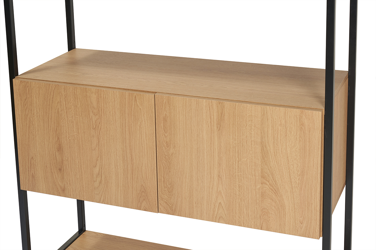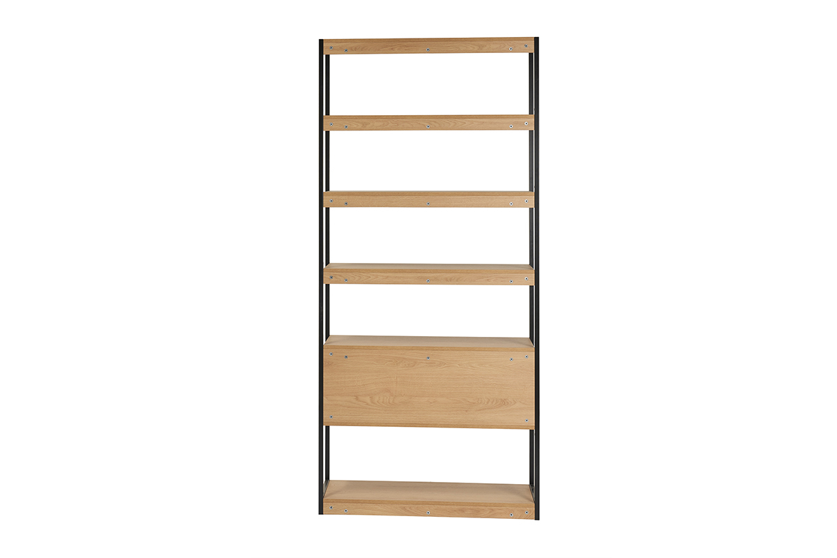 Idéale dans le séjour, l'entrée ou la chambre à coucher, cette bibliothèque avec étagères finition bois clair et métal noir habillera un mur nu de ses rangements supplémentaires.
