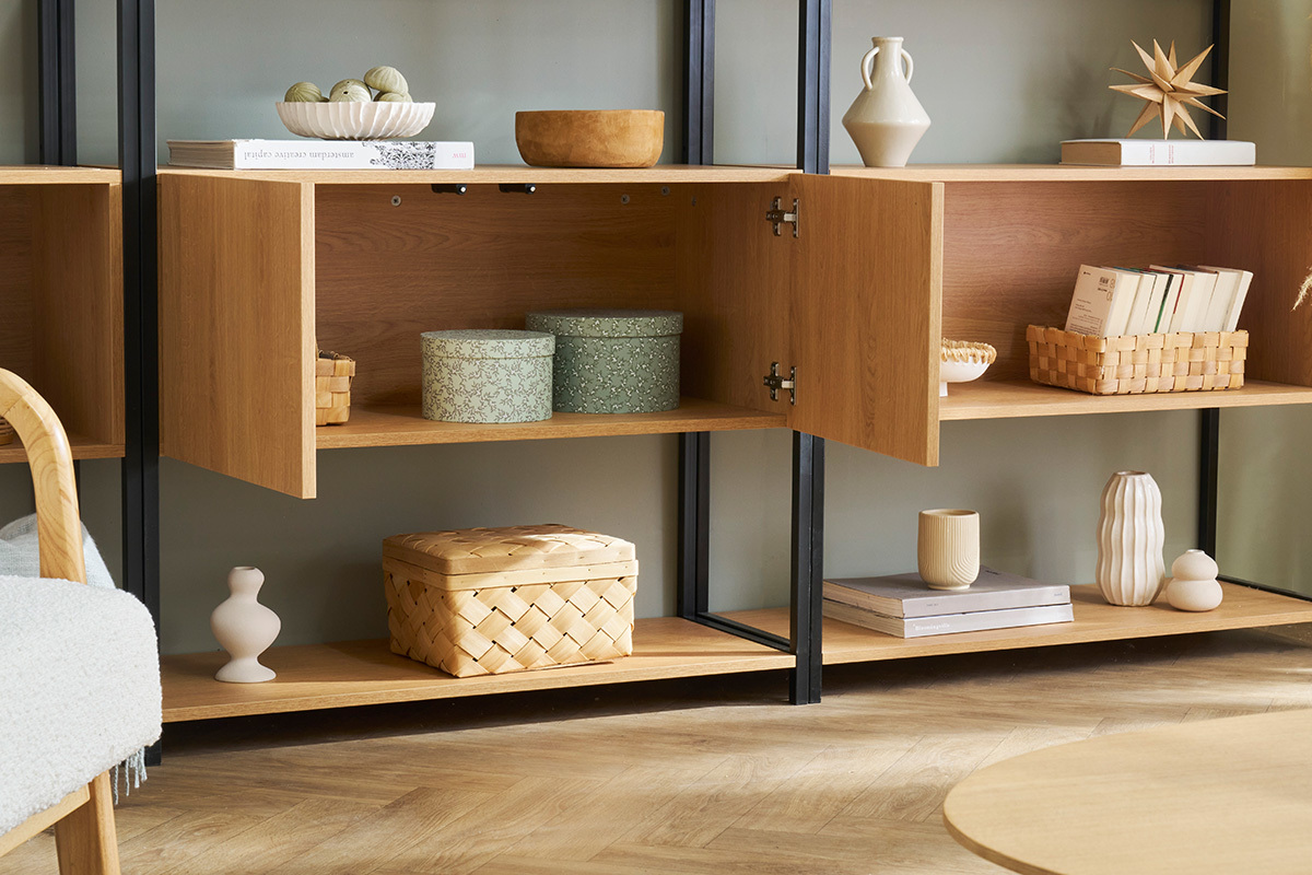 Concilier des rangements ouverts et fermés, l'un des atouts de cette bibliothèque en bois et métal !