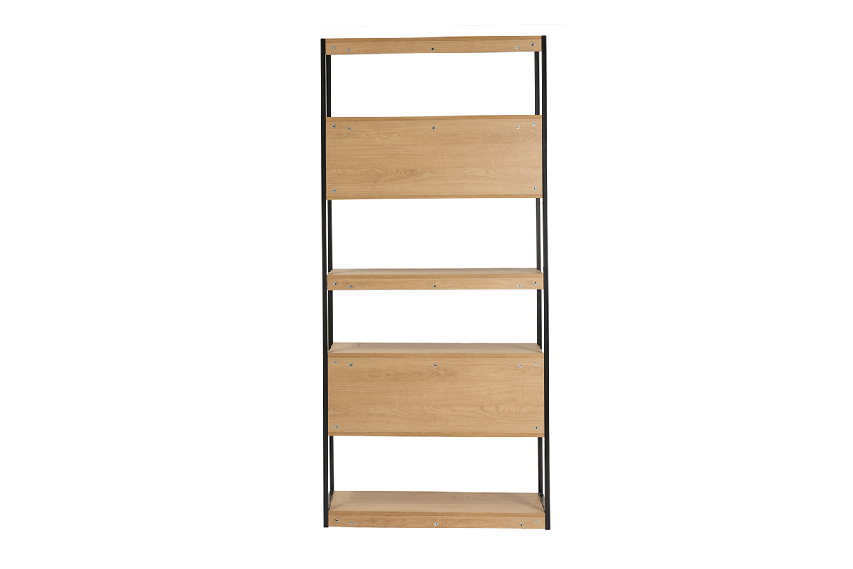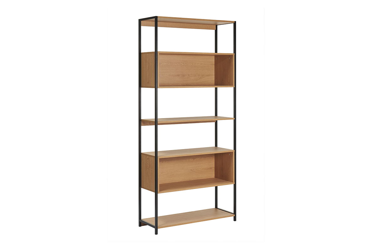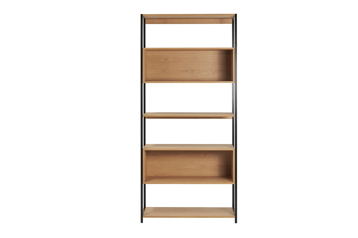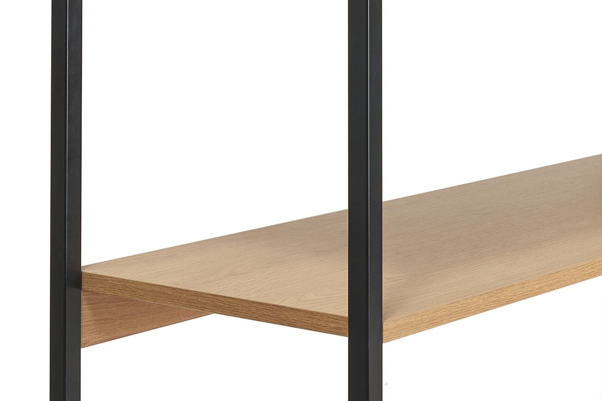 Soutenus par une solide structure en métal noir, les caissons et plateaux en panneaux de fibres de bois finition chêne clair offrent deux formats de rangement : 2 niches et 3 étagères. Avec ses dimensions L94 x P35 x H205 cm et sa faible largeur, FLEA ne manque pas de praticité !