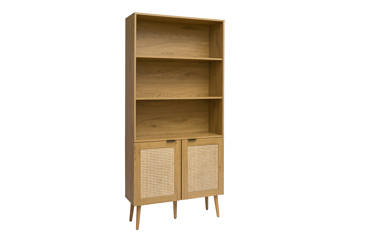 Apportez du caractère et du style à votre intérieur avec la bibliothèque MANILLE. Elle possède une structure en panneaux de particules de bois mélaminé finition chêne, rehaussée de pieds en chêne massif et de portes en cannage rotin. Mesurant 190 cm de hauteur, cette pièce combine une esthétique naturelle et une fonctionnalité parfaite pour répondre à vos besoins de rangement et de décoration.