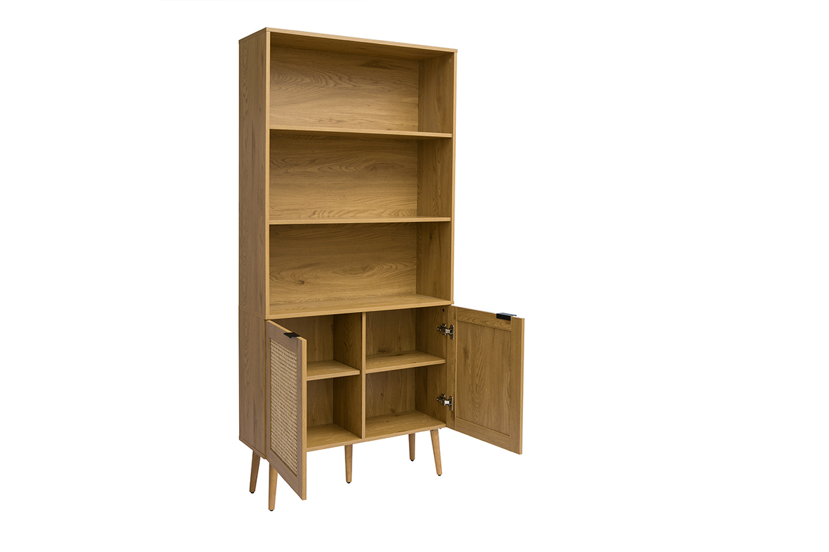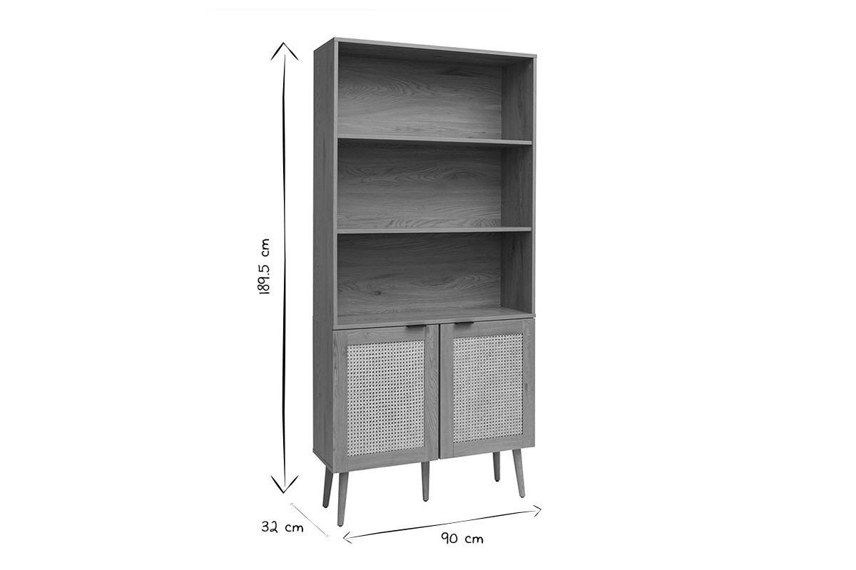 La partie inférieure de la bibliothèque est équipée de deux portes assorties de cannage en rotin, apportant une touche artisanale et bohème à l'ensemble. Derrière ces portes, vous découvrirez 4 compartiments pratiques pour ranger vos affaires discrètement, tels que des documents, accessoires ou objets que vous souhaitez garder hors de vue. Le contraste entre étagères ouvertes et rangements fermés offre à ce meuble un équilibre parfait entre praticité et élégance.
