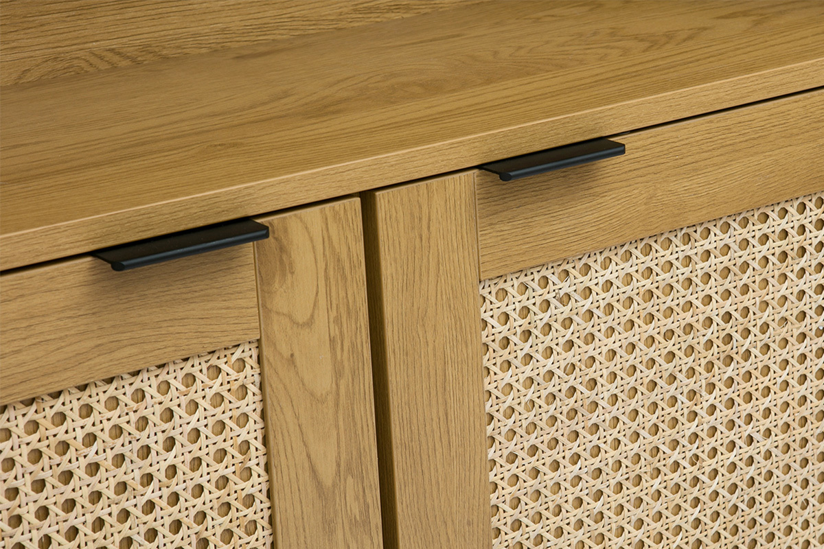 Matière : panneaux de particules de bois mélaminé finition chêne, cannage de rotin
