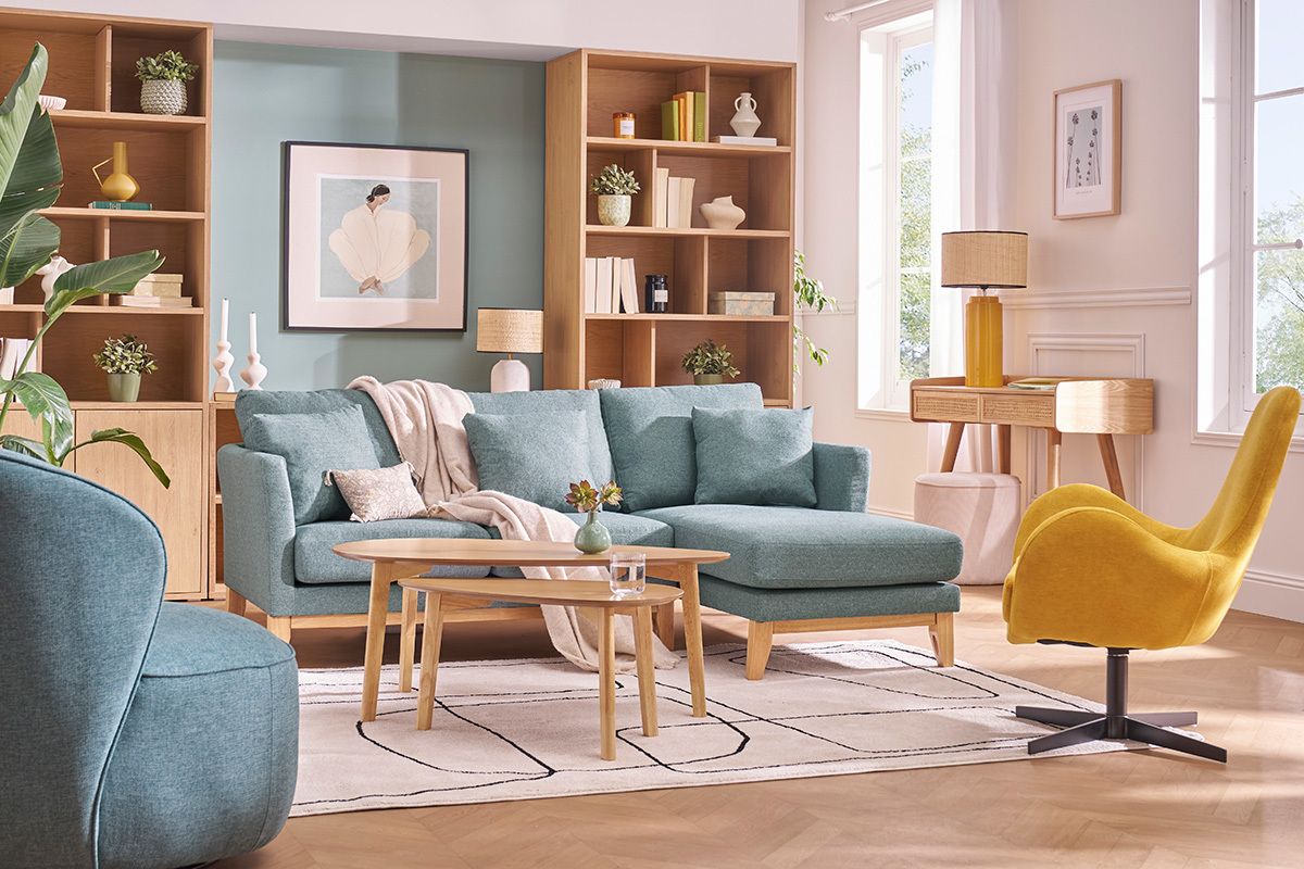 Pour l'associer, des pièces de mobilier aux tons naturels mettront particulièrement en valeur les nuances chaudes de l'effet chêne. Buffet, table à manger, ou encore console en bois contribueront à créer un « home sweet home » très harmonieux.