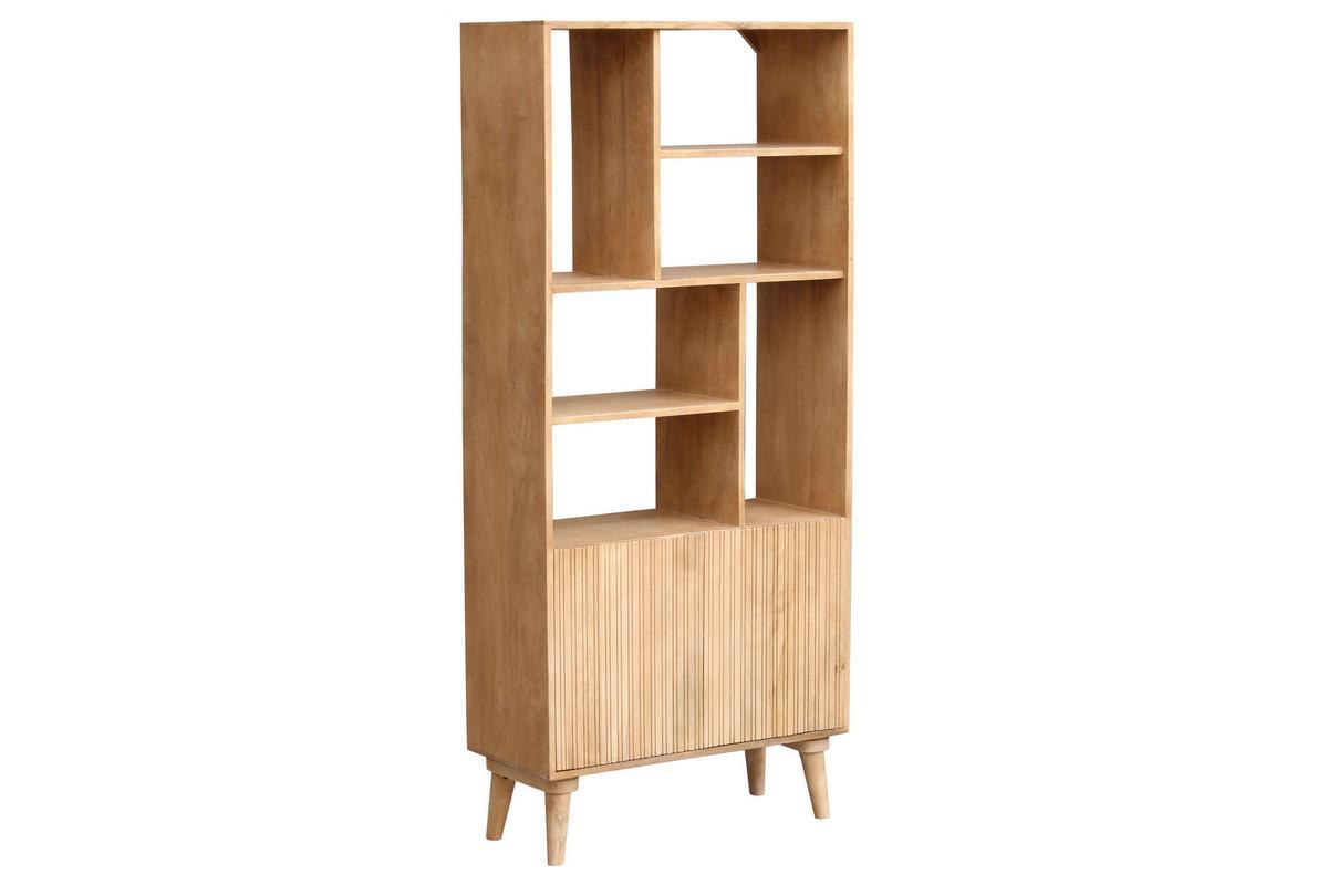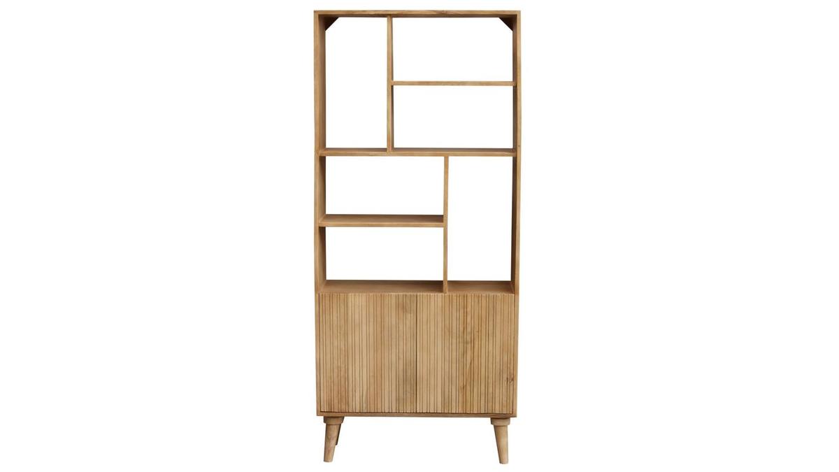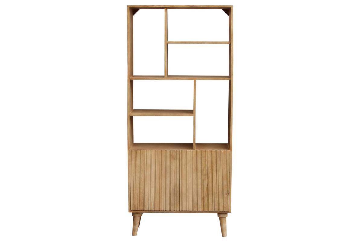 En dessinant cette bibliothèque j'ai voulu lui donner la particularité de pouvoir mettre en valeur certaines choses et d'en dissimuler d'autres. La succession de rangements verticaux et horizontaux procure du rythme et permet d'exposer des articles déco avec des formats très variés. Une gravure linéaire vient sublimer les deux portes en manguier massif qui pourront dissimuler vos objets du quotidien.