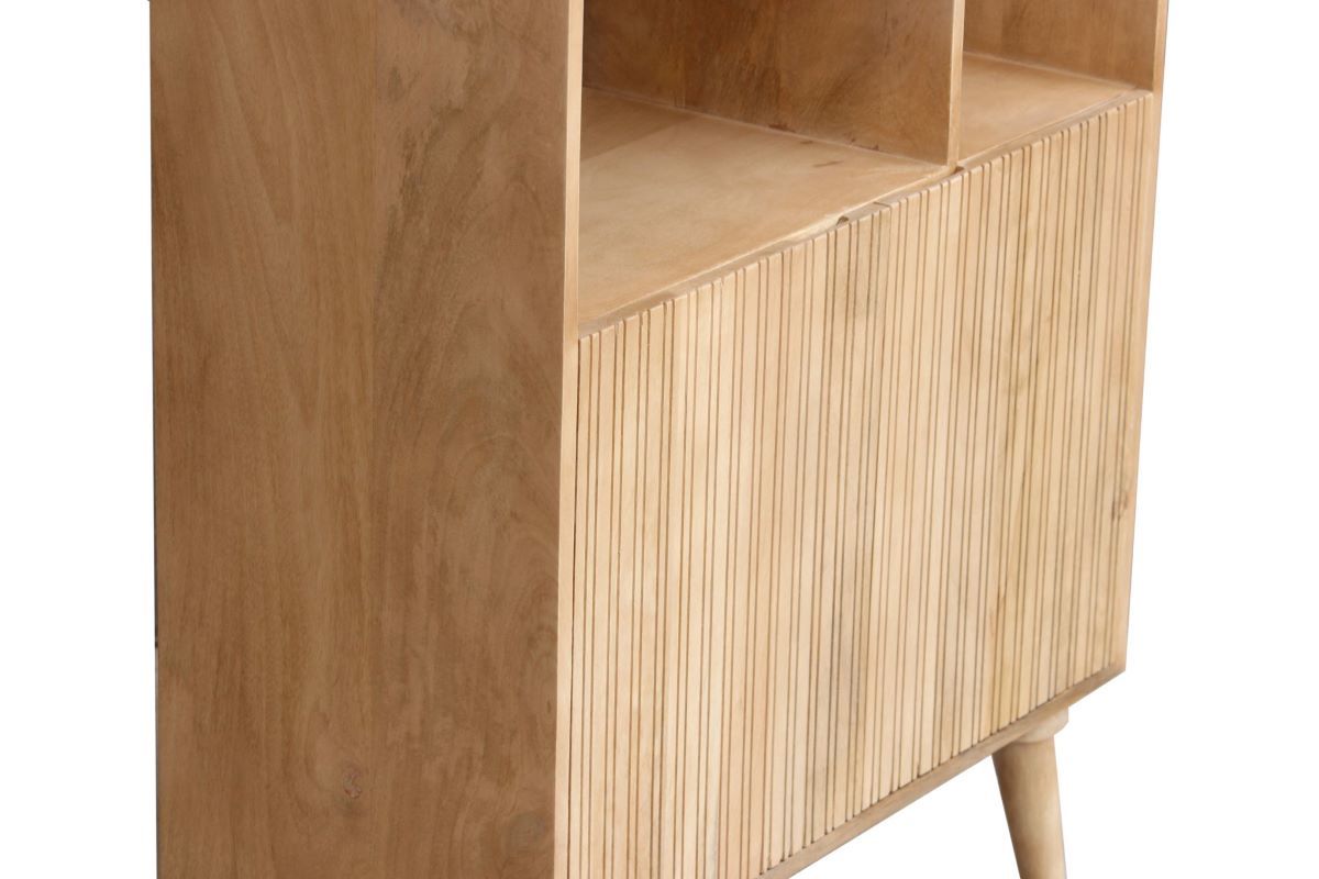 Ses deux portes battantes s'ouvrent grâce à un système push-pull, esthétique et discret. Les portes ont été gravées dans la matière. Les stries répétées forment un motif texturé à la fois graphique et moderne. L'ensemble est soutenu par quatre pieds compas au look rétro résolument fifties.