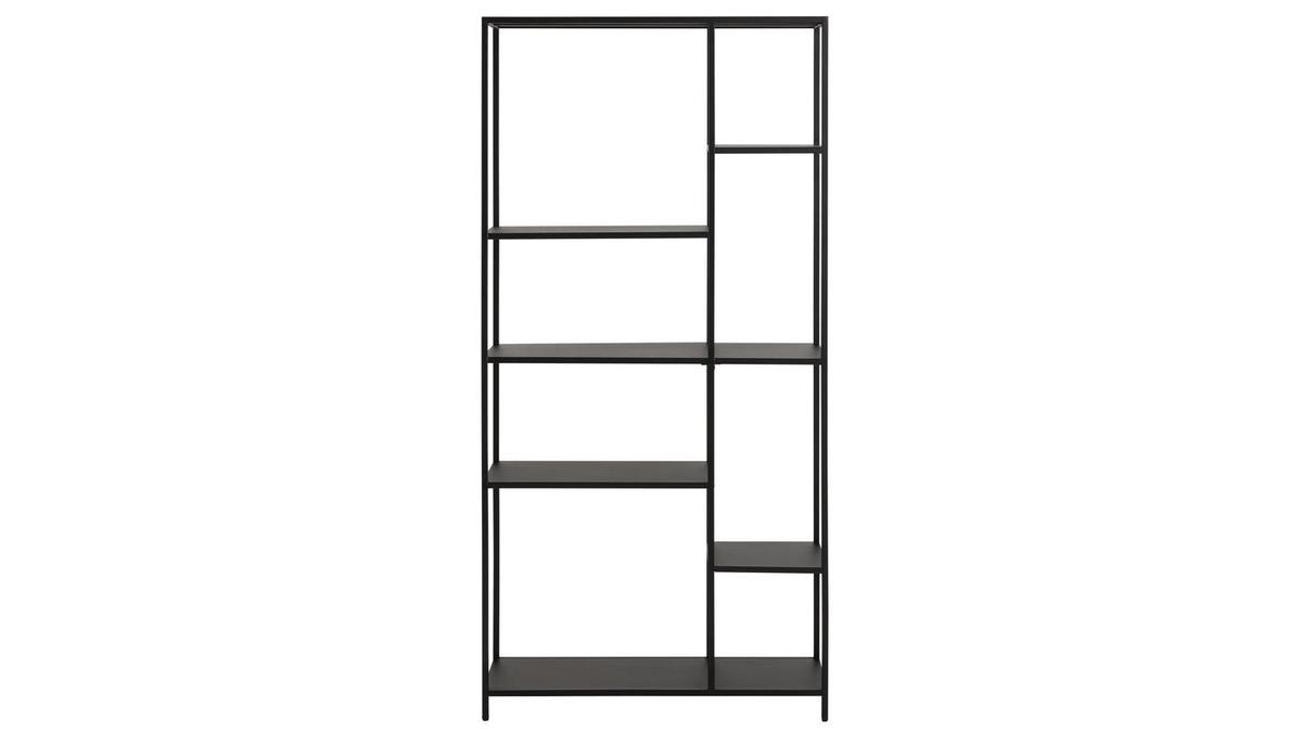 Très graphique, cette bibliothèque étagère design présente un superbe assemblage asymétrique. Elle se compose de six plateaux reliés par une fine structure en métal noir. On aime particulièrement les plateaux de tailles variées disposés à des hauteurs différentes.