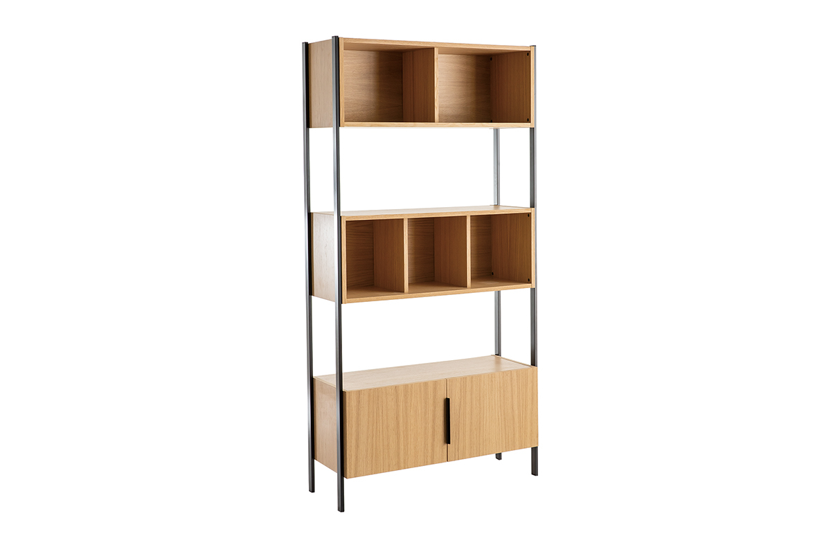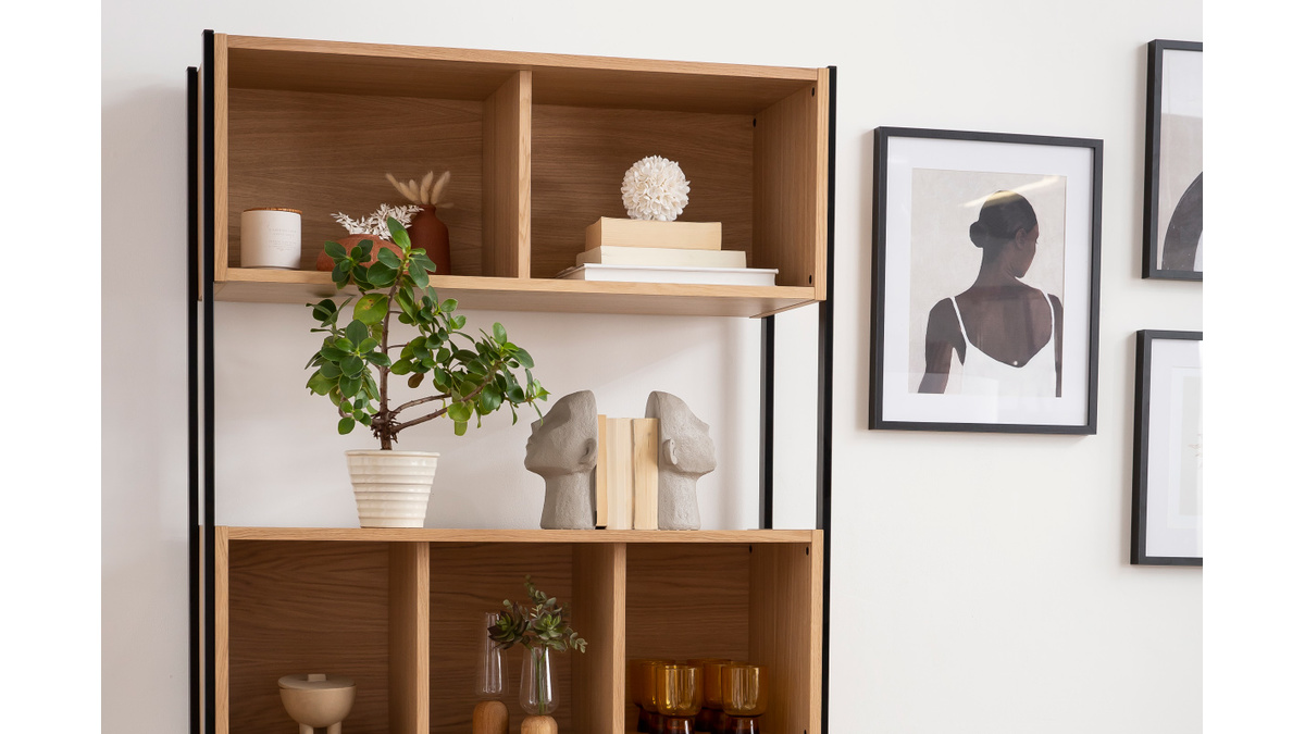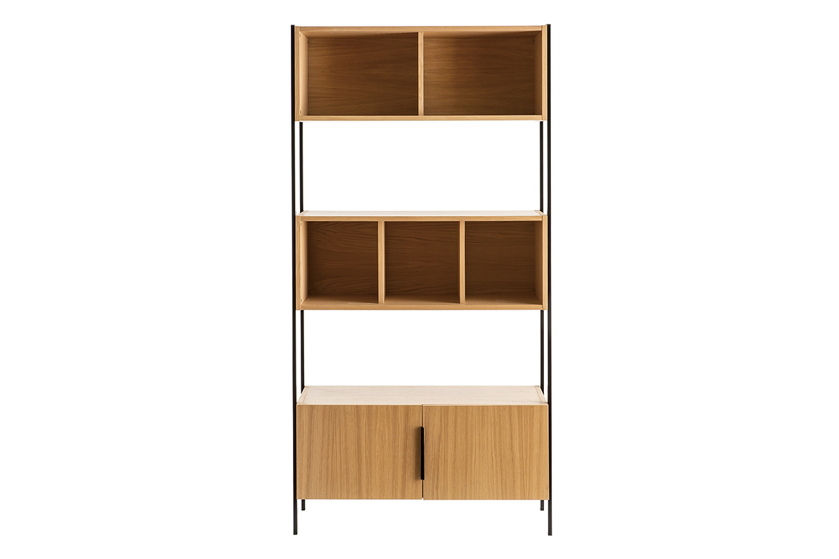 Idéale dans un salon ou dans un grand bureau, cette bibliothèque haute aux dimensions L98 x P35 x H195 cm habillera votre intérieur et lui donnera une vraie personnalité. Son placage chêne et ses détails métalliques noirs en font une belle pièce de caractère qui rappelle subtilement le style industriel. Un meuble de rangement totalement dans l'air du temps qui saura ravir les mordus de déco !