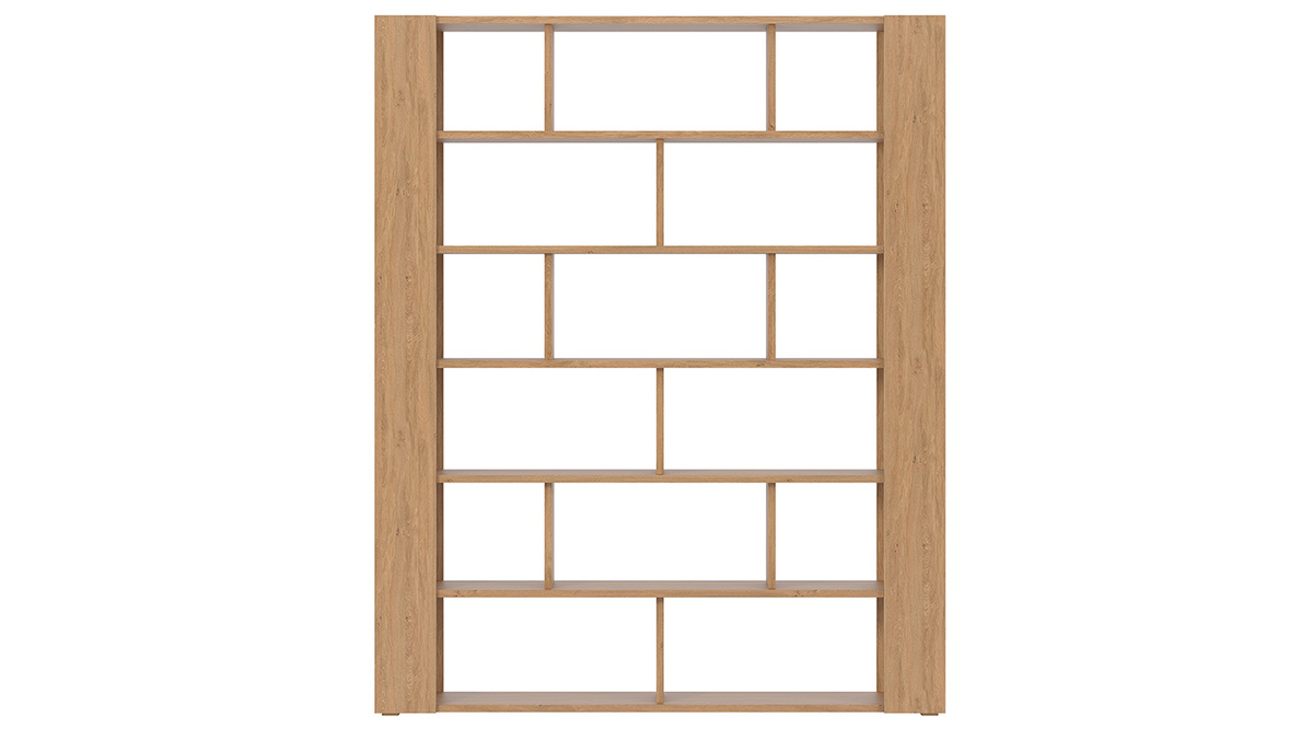 Cette bibliothèque scandinave comprend pas moins de 15 niches pour organiser toutes les affaires de la maison. Composée d'une structure en mélaminé finition chêne, cette bibliothèque ouverte accueillera livres, boîtes de rangement, lampes et objets déco avec style.