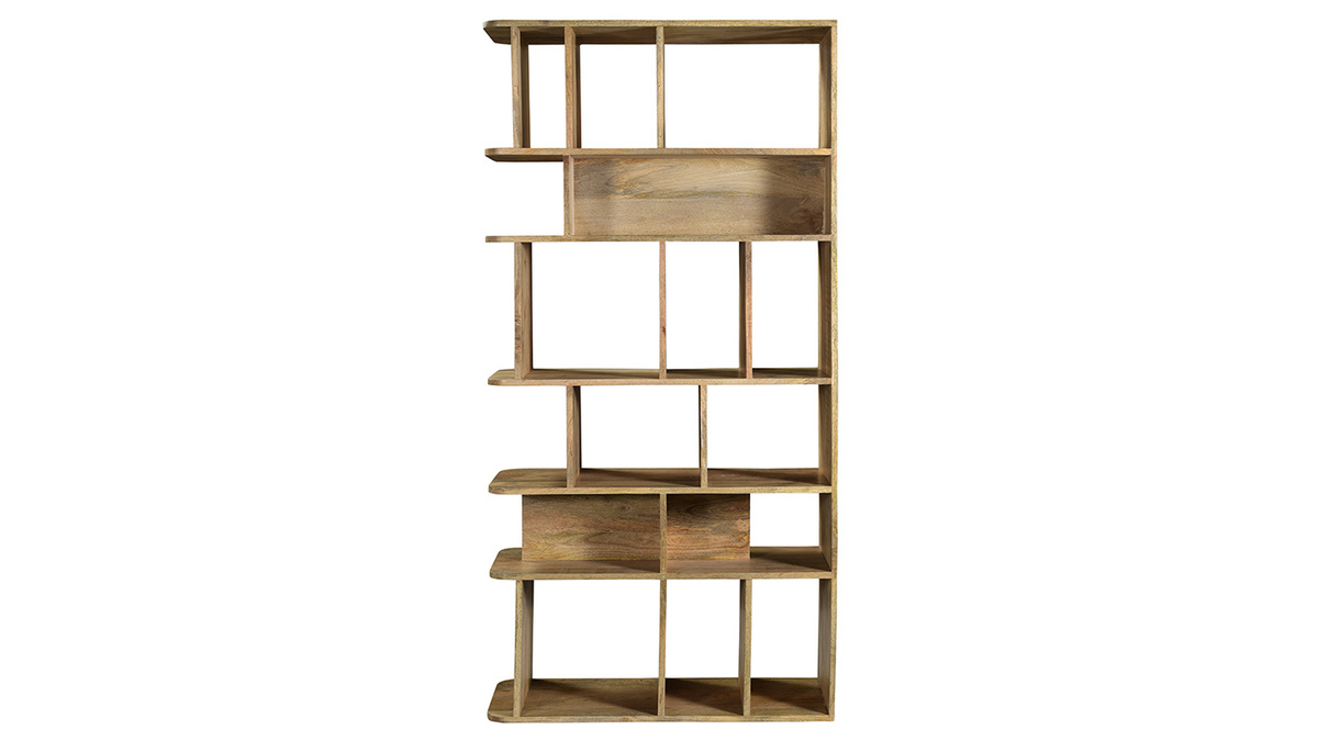 Bibliothèque en bois manguier massif vue de face avec étagères ouvertes.