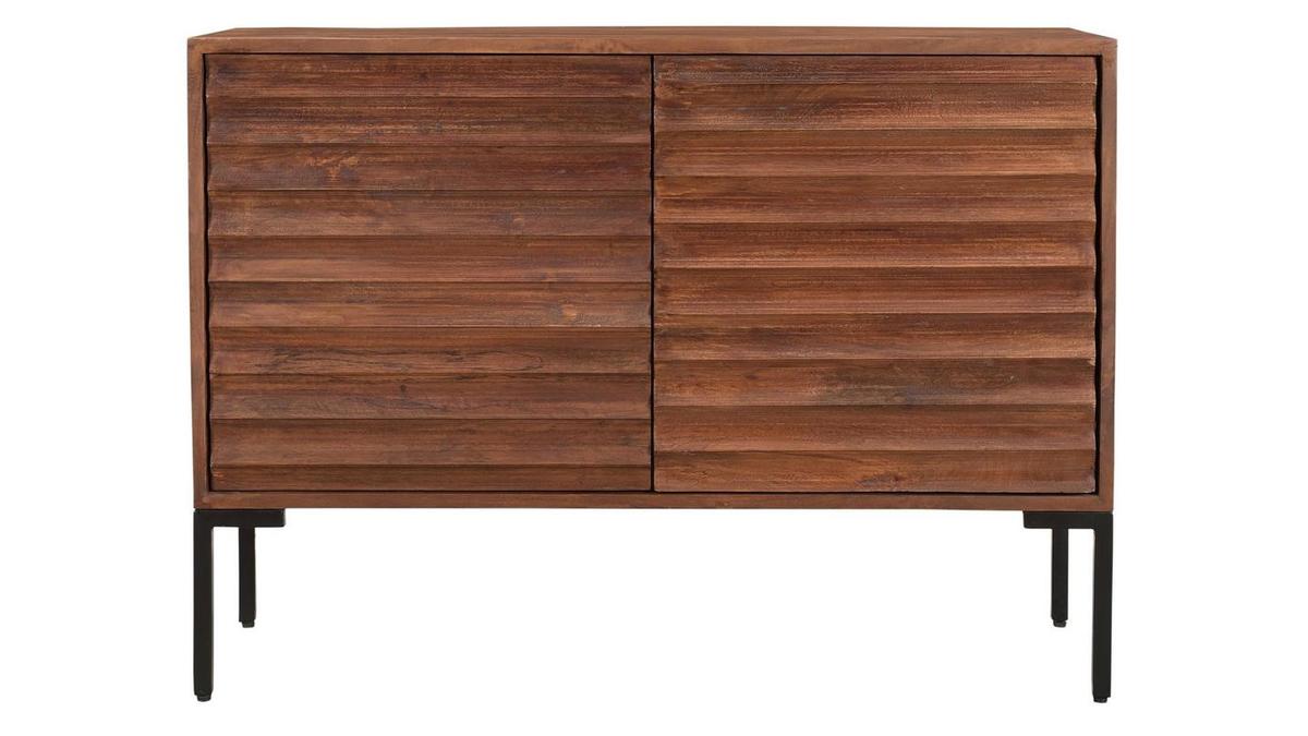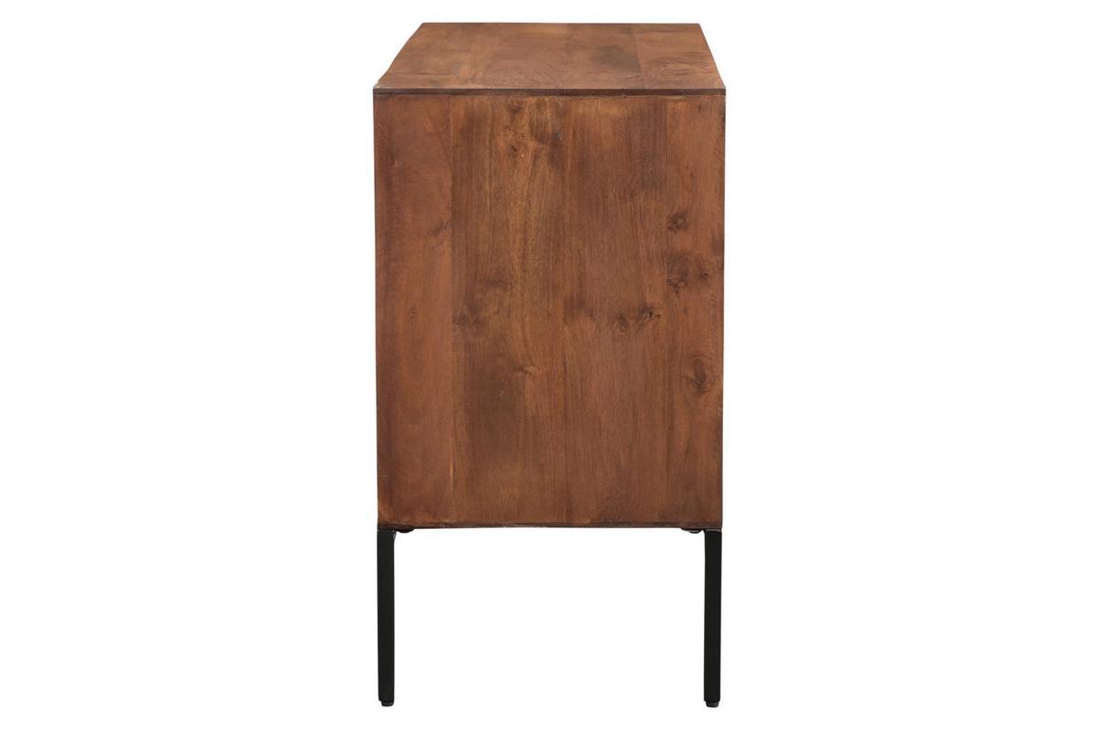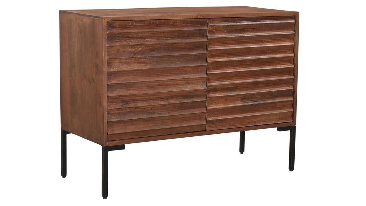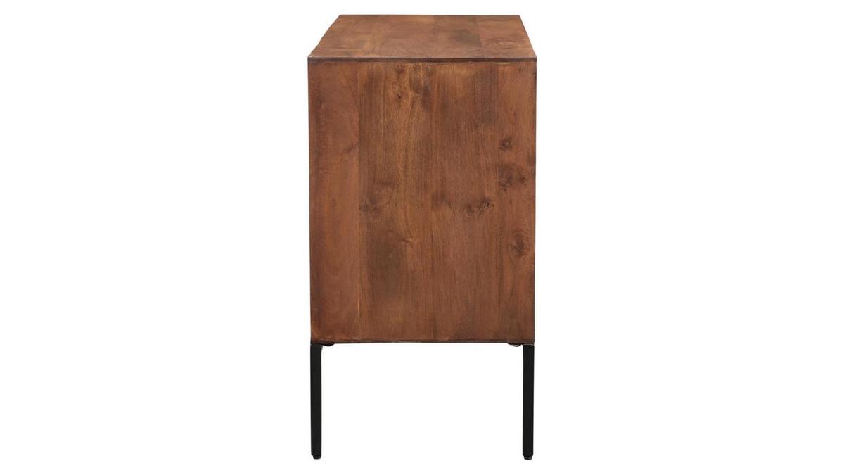 Ce buffet en manguier massif est issu d'un joli travail sur la matière. Ses façades sont sculptées directement dans le bois. Les saillies dessinent des lignes horizontales qui forment un motif répété ultra graphique. Conçu de manière artisanale avec le cachet unique du "fait main", ce buffet en bois foncé se distingue par son caractère à la fois authentique et très contemporain. La patine marron foncé appliquée sur ce meuble de rangement nourrit le bois tout en renforçant un peu plus son rendu chaud et naturel. On adore aussi l'association de ce bois exotique avec le métal utilisé pour le piètement.