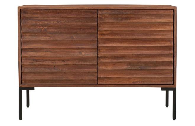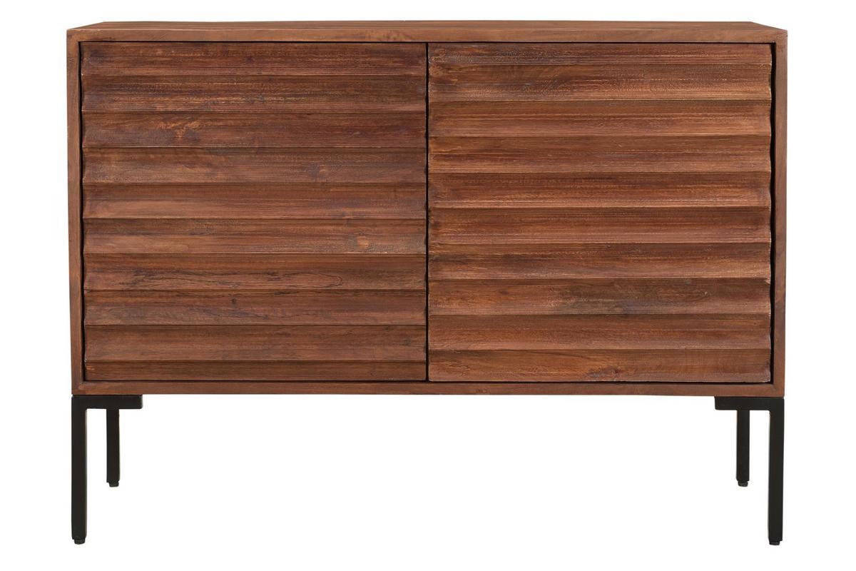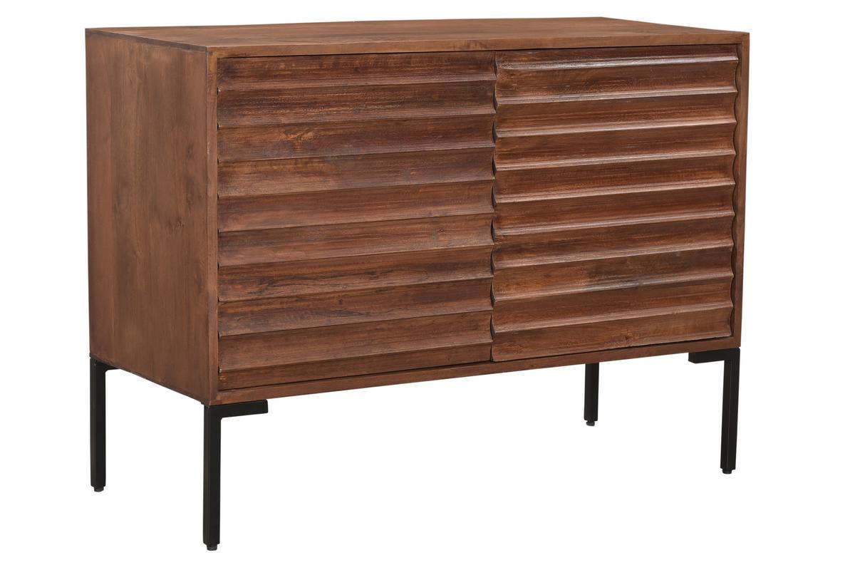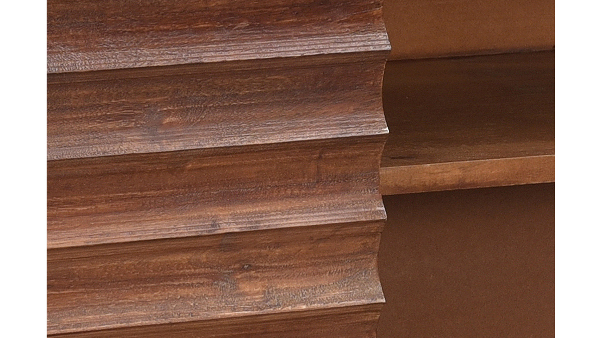 Ce buffet en manguier massif est issu d'un joli travail sur la matière. Ses façades sont sculptées directement dans le bois. Les saillies dessinent des lignes horizontales qui forment un motif répété ultra graphique. Conçu de manière artisanale avec le cachet unique du "fait main", ce buffet en bois foncé se distingue par son caractère à la fois authentique et très contemporain. La patine marron foncé appliquée sur ce meuble de rangement nourrit le bois tout en renforçant un peu plus son rendu chaud et naturel. On adore aussi l'association de ce bois exotique avec le métal utilisé pour le piètement.