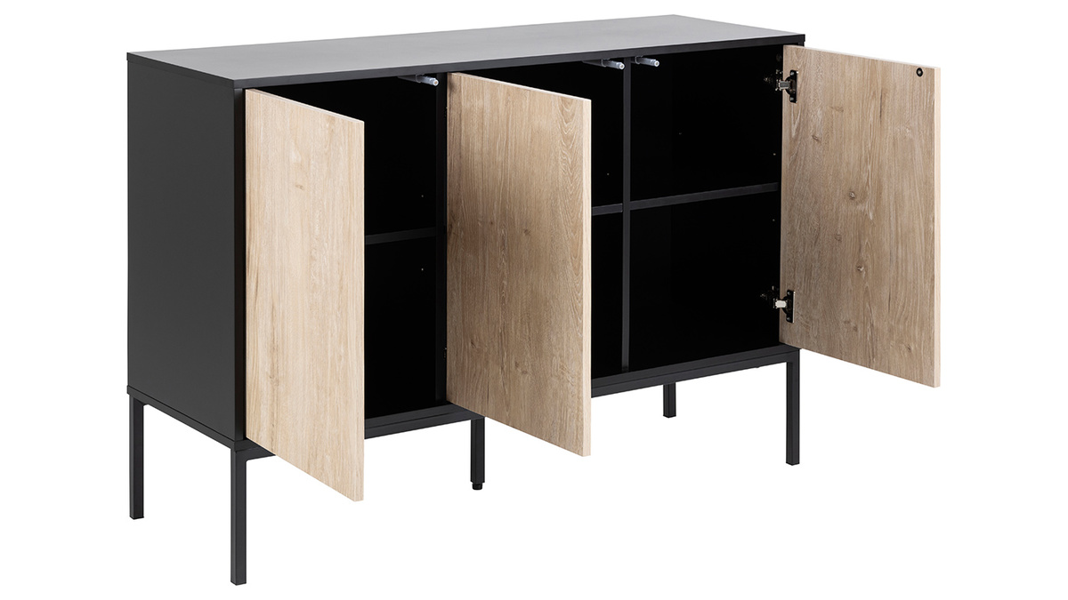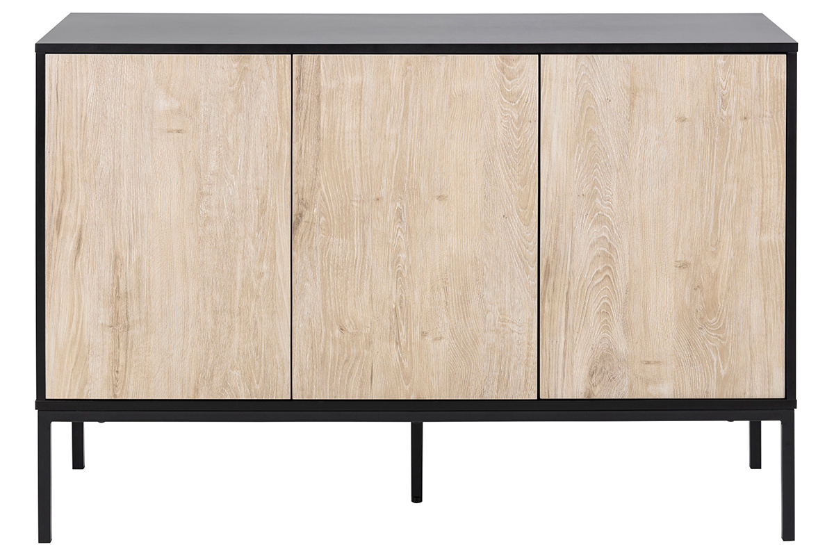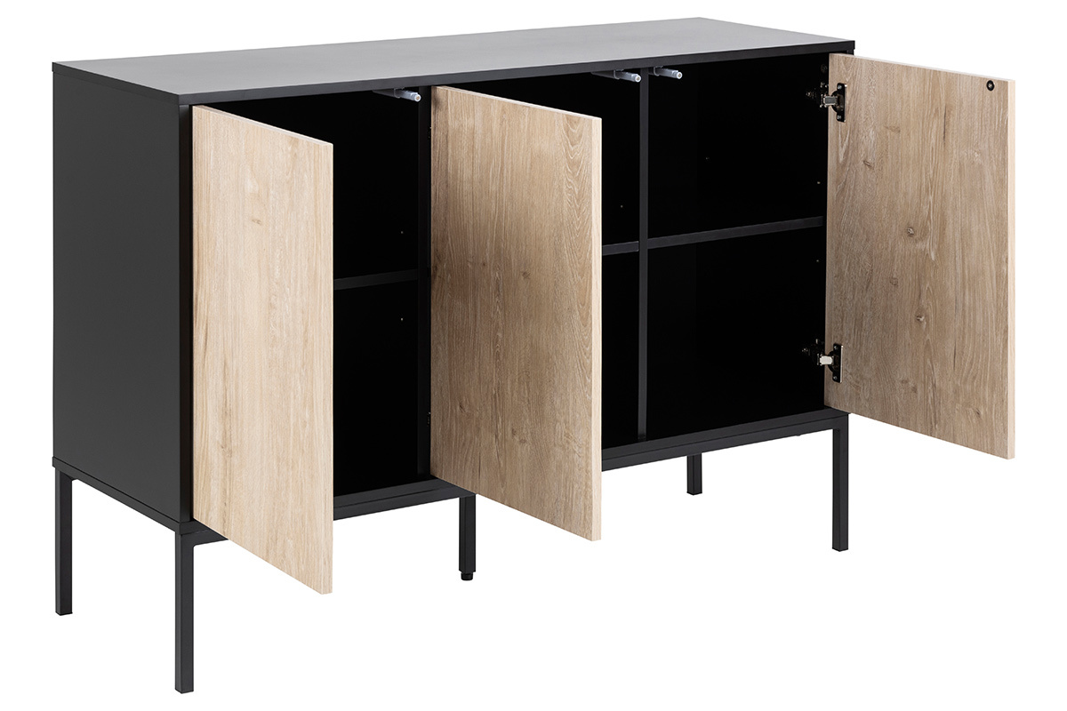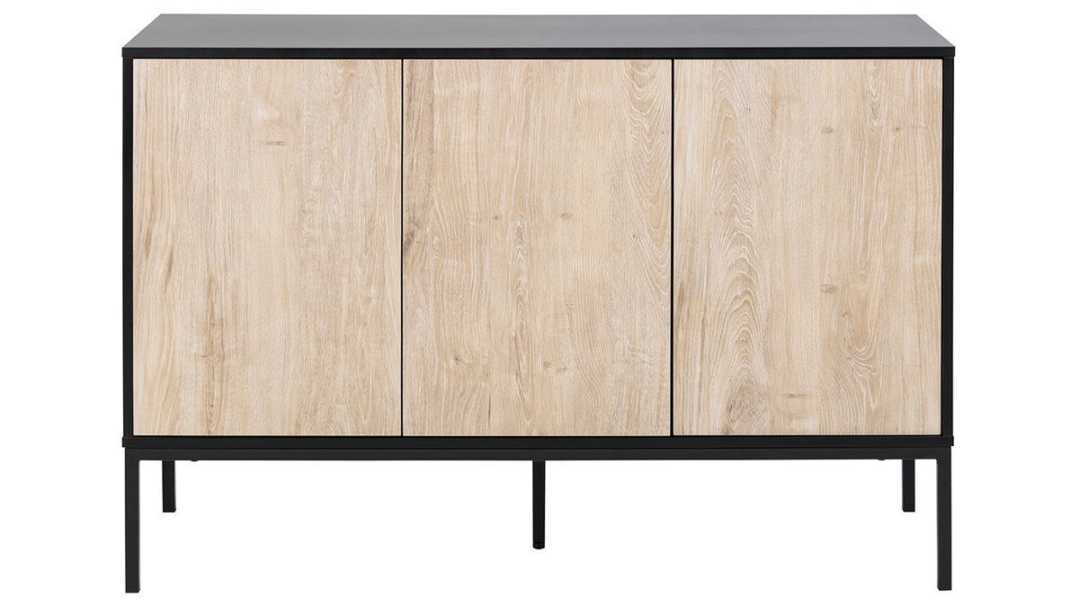 Ce meuble de rangement mélange les styles et les influences pour un résultat moderne. On retrouve une structure en panneaux de fibres de bois noir mat et des pieds en métal assortis qui rappellent subtilement les meubles industriels. Les trois portes finition chêne blanchi apportent une touche de douceur et de modernité à cet ensemble. Le buffet TRESCA est une pièce de mobilier actuelle et pleine de charme.