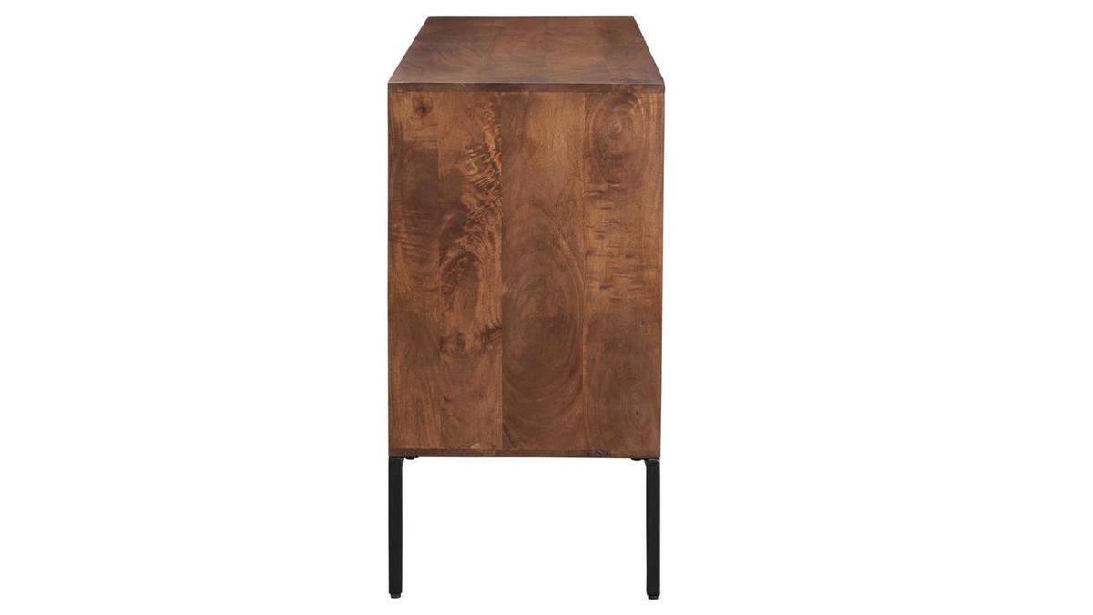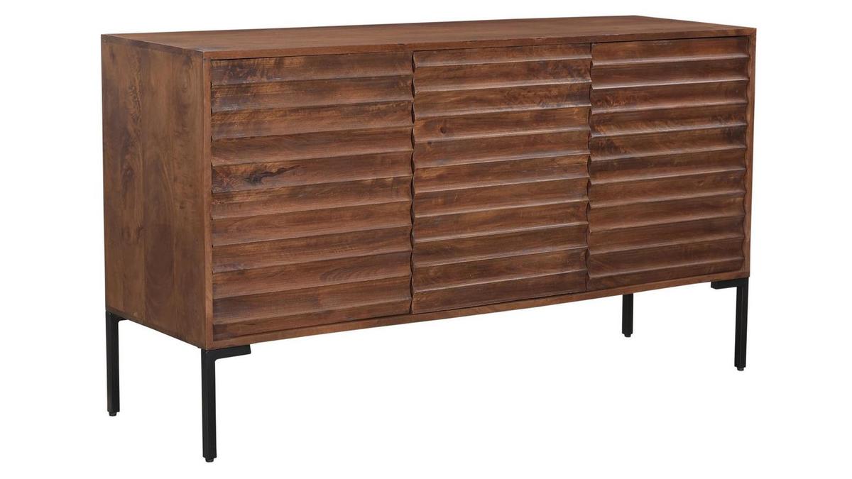 Ce buffet design à la silhouette affirmée est issu d'un superbe travail sur la matière. Réalisé en manguier massif, il se distingue par sa façade qui semble creusée par des sillons. Ce bois chaleureux et exotique a été travaillé de façon artisanale faisant de chaque buffet une pièce unique. La patine marron foncé appliquée sur ce buffet en bois nourrit la matière tout en renforçant un peu plus son caractère authentique.