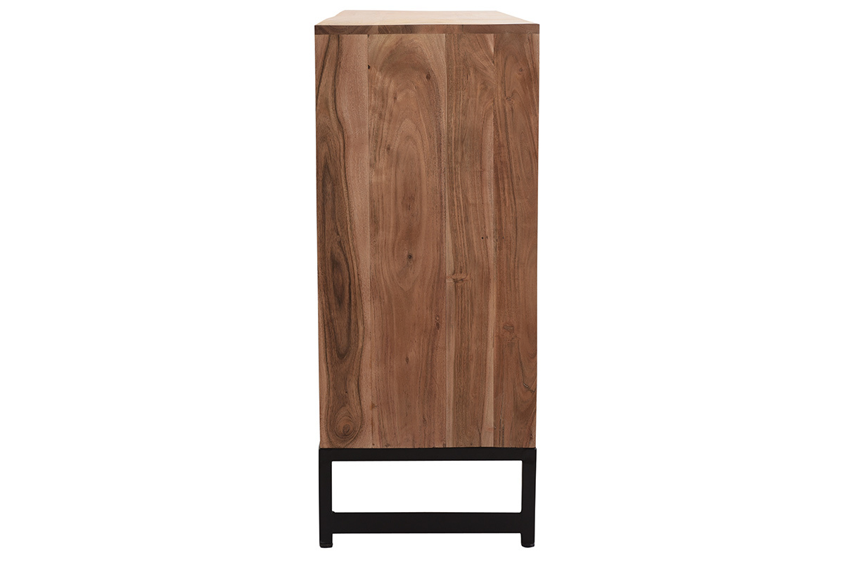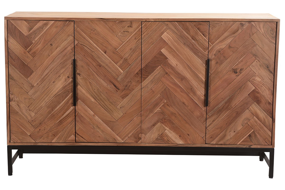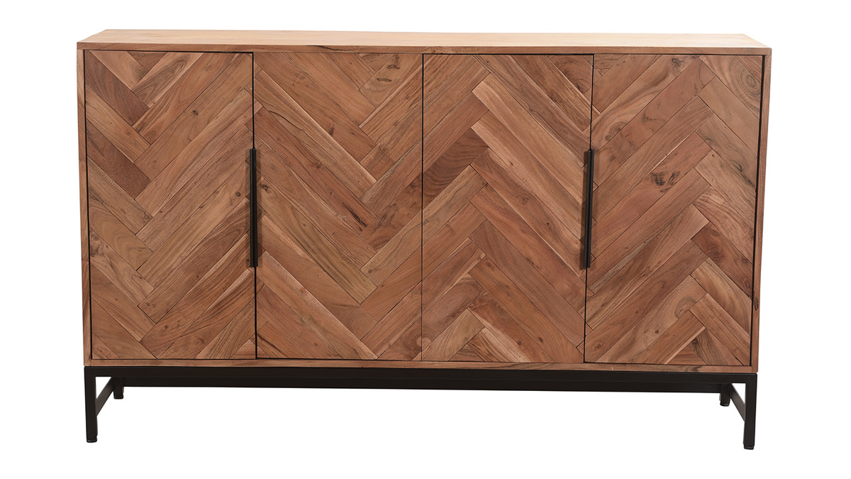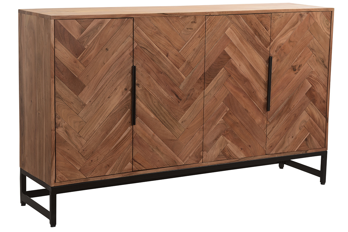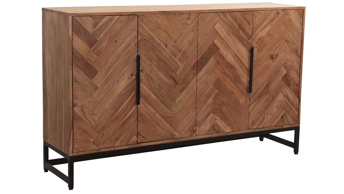 Ce buffet 4 portes est un meuble authentique. Il a été conçu selon des techniques artisanales. C'est ce rendu "fait main" associé au motif moderne des portes qui fait tout le charme de ce meuble. L'acacia qui le compose est un bois aux tons légèrement rouges - une essence exotique a été spécialement choisi pour ses nuances singulières. Marié avec un piètement métallique noir travaillé tout en finesse, il offre un rendu brut intemporel.